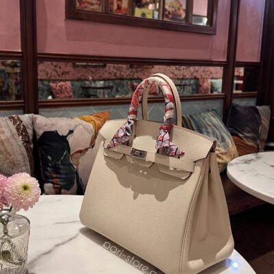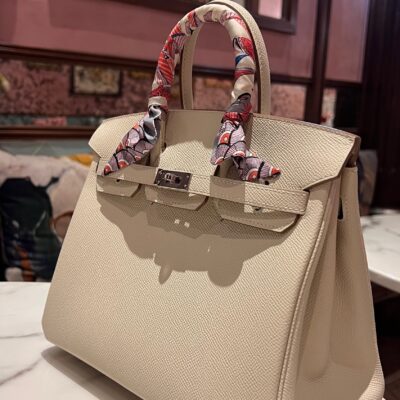 Birkin 25 in epsom leather in Craie white colour. Fully hand-sewn with beeswax thread. Silver hardware. All bags are made