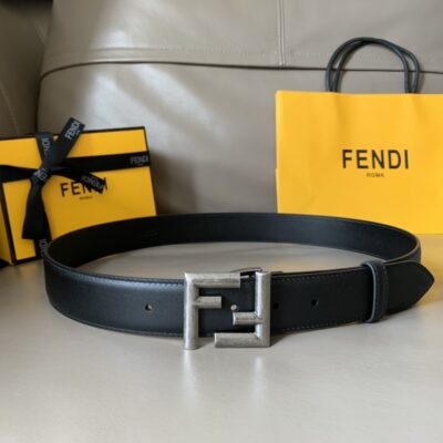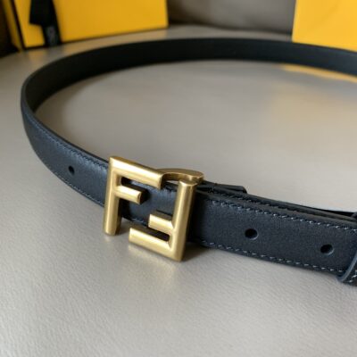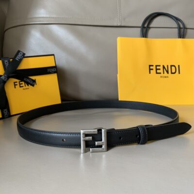 Fendi counter new women’s casual thin belt, width 2 cm, black double-sided calfskin with loop and FF buckle, antique silver-coated