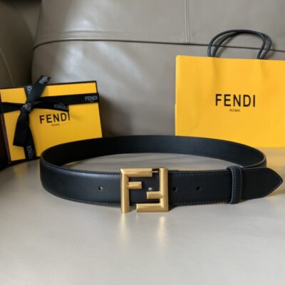 Fendi counter new unisex casual belt, width 3.4cm, black double-sided calfskin with loop and FF buckle, vintage gold-coated metal hardware,