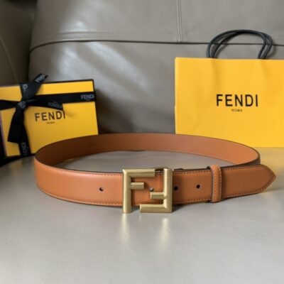Fendi counter new unisex casual belt, width 3.4cm, brown double-sided calfskin with loop and FF buckle, vintage gold-coated metal hardware,