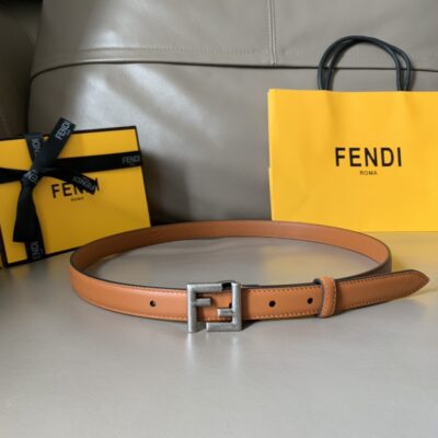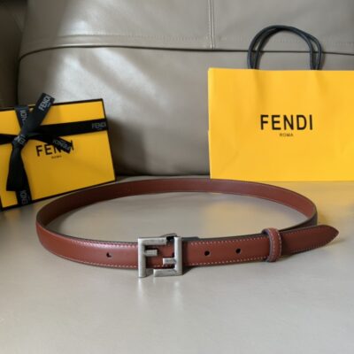 Fendi counter new women’s casual thin belt, width 2 cm, brown double-sided calfskin with loop and FF buckle, antique silver-coated