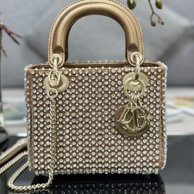 Lady Dior three-frame embroidery full of diamonds in gold, with imported lamb tendon inside, sparkling, crafted with gold embroidery fabric,