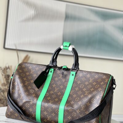 Crafted from Monogram Macassar canvas, the Keepall duffel is functionally updated and eye-catching, featuring calfskin details in designer Virgil Abloh’s