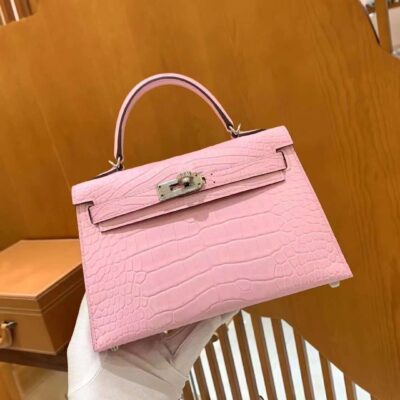 Mini Kelly 2nd Generation 19cm Cherry Blossom Powder Imported first-class “□” American crocodile French beeswax thread 100% hand-sewn