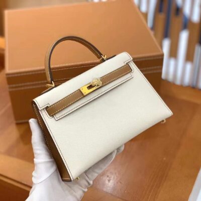 Mini Kelly 2nd Generation 19cm Craie and Golden Brown. Imported Epsom cowhide, French beeswax thread, 100% hand-sewn