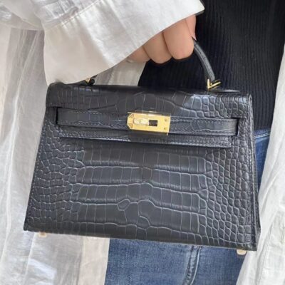 Mini Kelly in Matte Black Crocodile