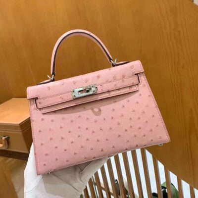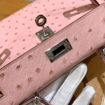 Mini Kelly II 19cm Rose Sakura. Imported South African KK grade ostrich leather. All hand-sewn