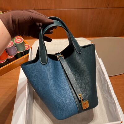 Picotin Lock Vegetable Basket 18cm. Clemence Leather. W0 Bosphorus Green/6O Pine Green. Gold Buckle