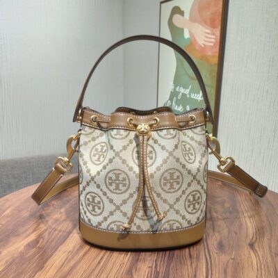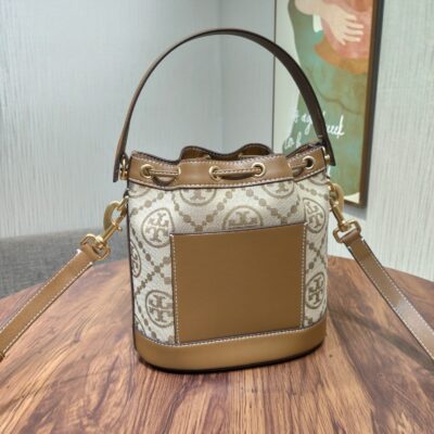 No. 1615 TORY BURCH Monogram 2021 summer new drawstring bucket bag Textured canvas fabric with a neat bag body, retro