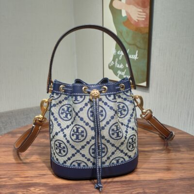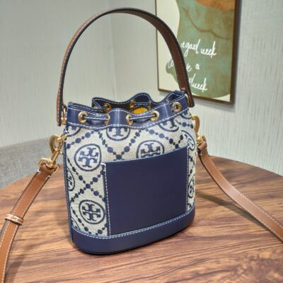 Number 1615 TORY BURCH Monogram 2021 Summer New Drawstring Bucket Bag The textured navy blue canvas fabric is matched with