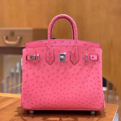 Birkin 25cm Lipstick Pink Silver Buckle Imported South African KK grade ostrich leather. All hand-sewn