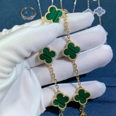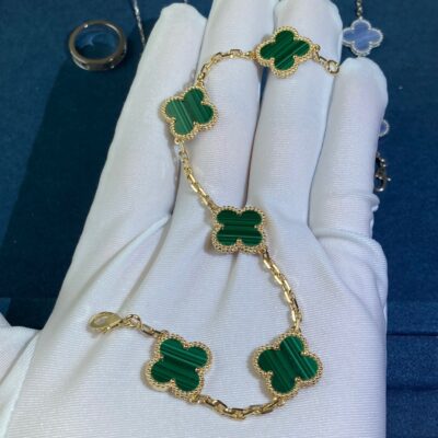 Five-Flower Malachite Clover Bracelet, Yellow Gold