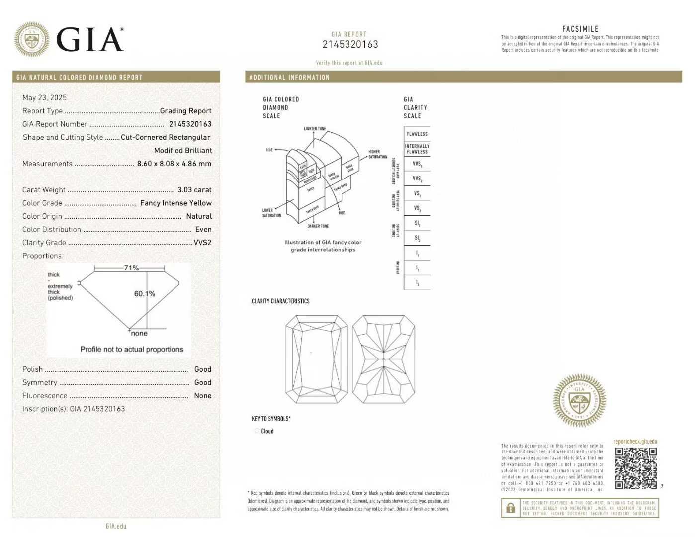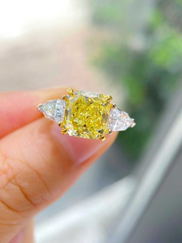 Brilliant and eye-catching with intense yellow color and exceptional clarity. Open pavilion (no closed culet) ensures maximum brilliance. Accented with shield-shaped white diamonds on both sides, creating a timeless and elegant three-stone design.