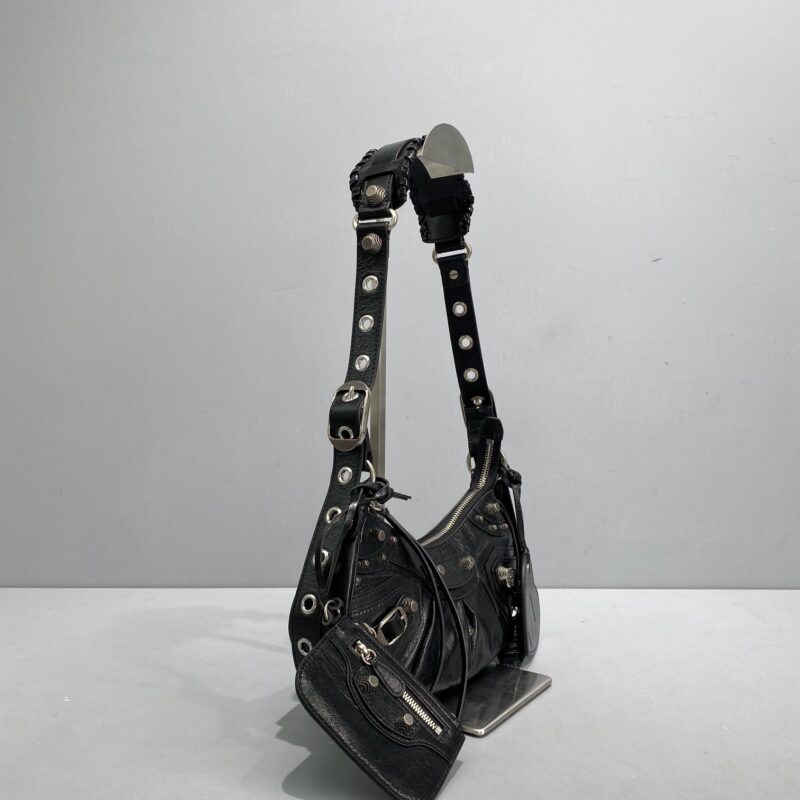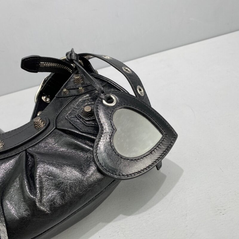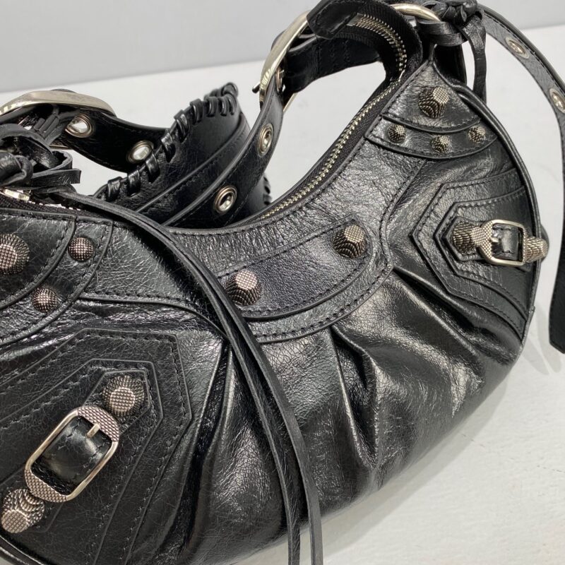 Small Black Balenciaga Le Cagole Half Moon Armpit/Crossbody Bag The traditional motorcycle bag has been improved with adjustable woven shoulder straps, additional eyelets, external leather card holder, heart-shaped hanging mirror. Following the small and exquisite design of classic motorcycle elements, various carrying methods and each texture design is really enough. Now, the upper body is full of high-level sense and super casual atmosphere. Style number: 92718 Small size: length 30X height 16X width 8CMC Large size: length 33X height 16X width 8.4CMC