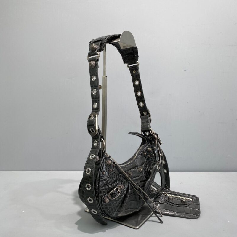 Small Black Balenciaga Le Cagole Half Moon Armpit/Crossbody Bag The traditional motorcycle bag has been improved with adjustable woven shoulder straps, additional eyelets, external leather card holder, heart-shaped hanging mirror. Following the small and exquisite design of classic motorcycle elements, various carrying methods and each texture design is really enough. Now, the upper body is full of high-level sense and super casual atmosphere. Style number: 92718 Small size: length 30X height 16X width 8CMC Large size: length 33X height 16X width 8.4CMC