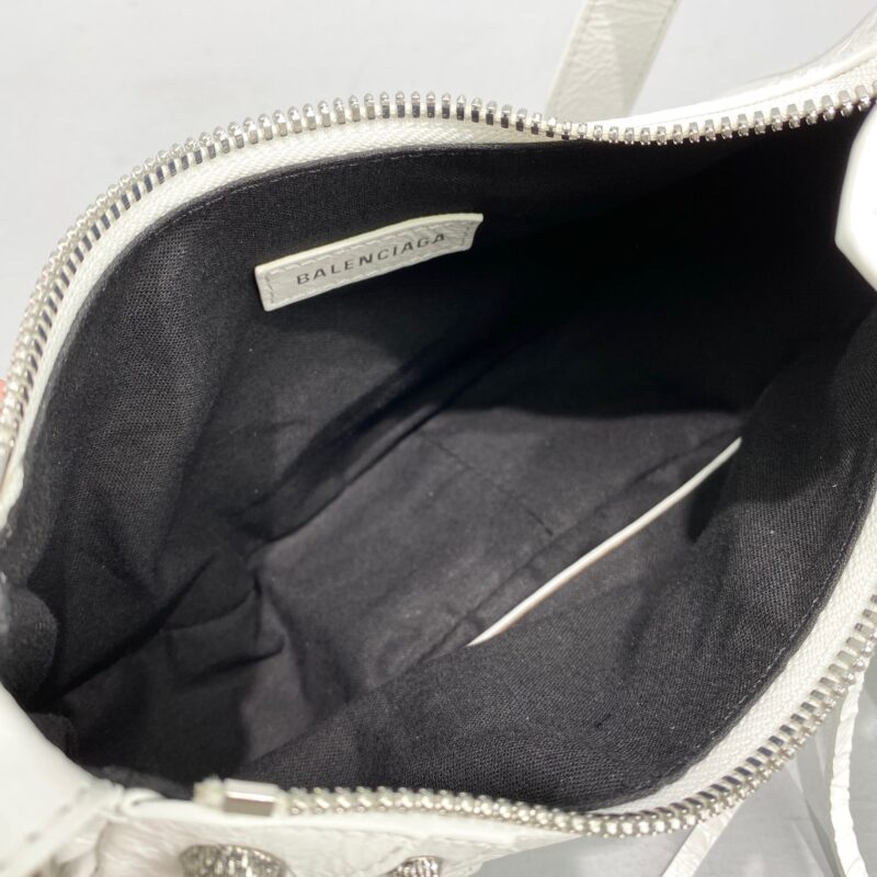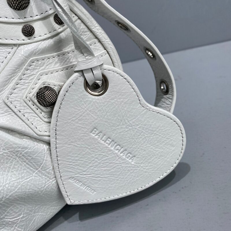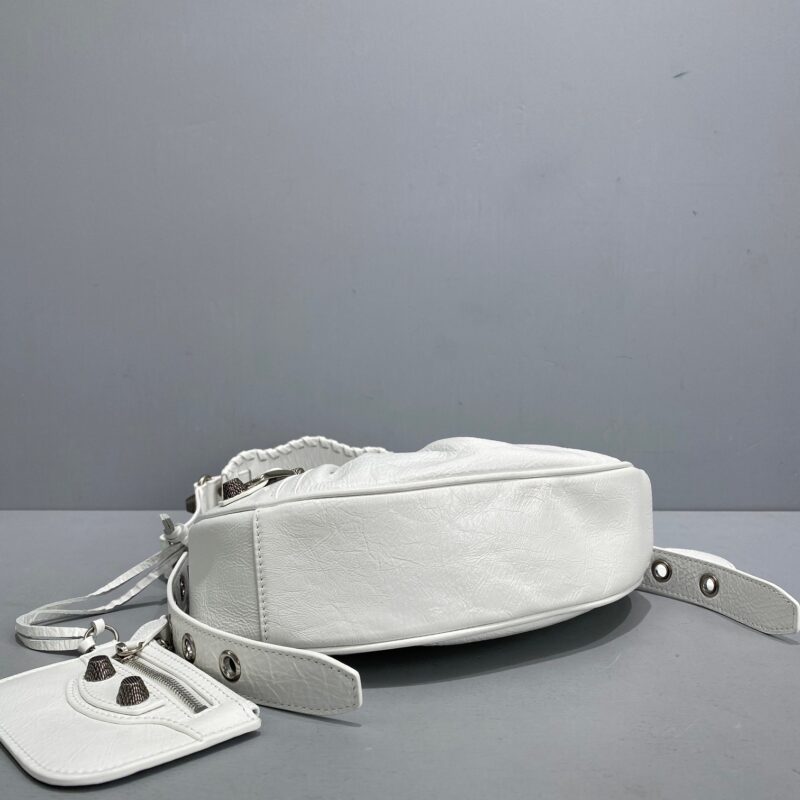 Small White Balenciaga Le Cagole Half Moon Armpit/Crossbody Bag The traditional motorcycle bag has been improved with adjustable woven shoulder straps, additional eyelets, external leather card holder, heart-shaped hanging mirror. Following the small and exquisite design of classic motorcycle elements, various carrying methods and each texture design is really enough. Now, the upper body is full of high-level sense and super casual atmosphere. Style number: 92718 Small size: length 30X height 16X width 8CMC Large size: length 33X height 16X width 8.4CMC