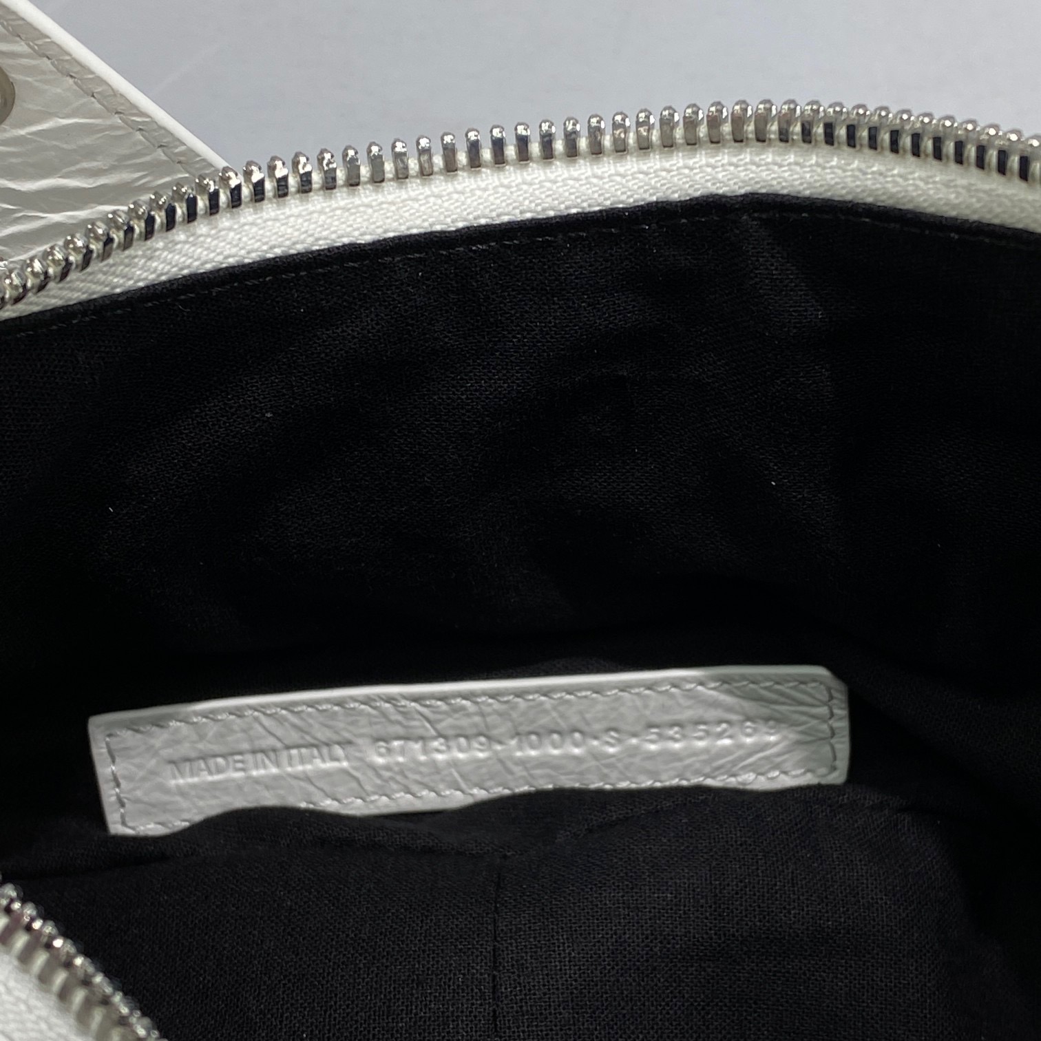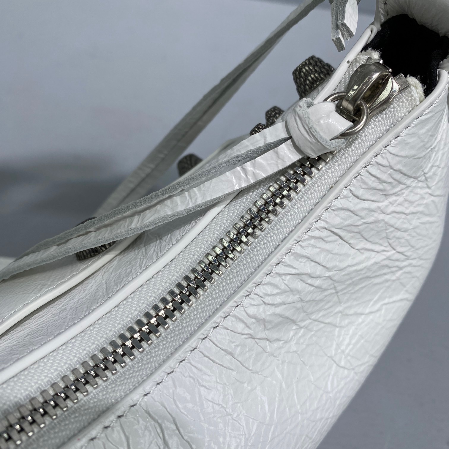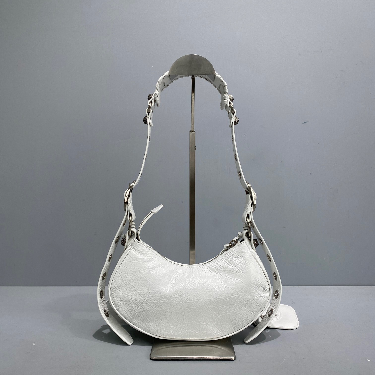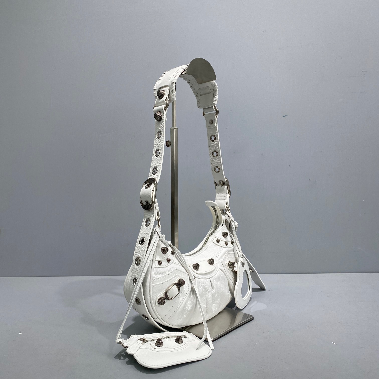 Small White Balenciaga Le Cagole Half Moon Armpit/Crossbody Bag The traditional motorcycle bag has been improved with adjustable woven shoulder straps, additional eyelets, external leather card holder, heart-shaped hanging mirror. Following the small and exquisite design of classic motorcycle elements, various carrying methods and each texture design is really enough. Now, the upper body is full of high-level sense and super casual atmosphere. Style number: 92718 Small size: length 30X height 16X width 8CMC Large size: length 33X height 16X width 8.4CMC