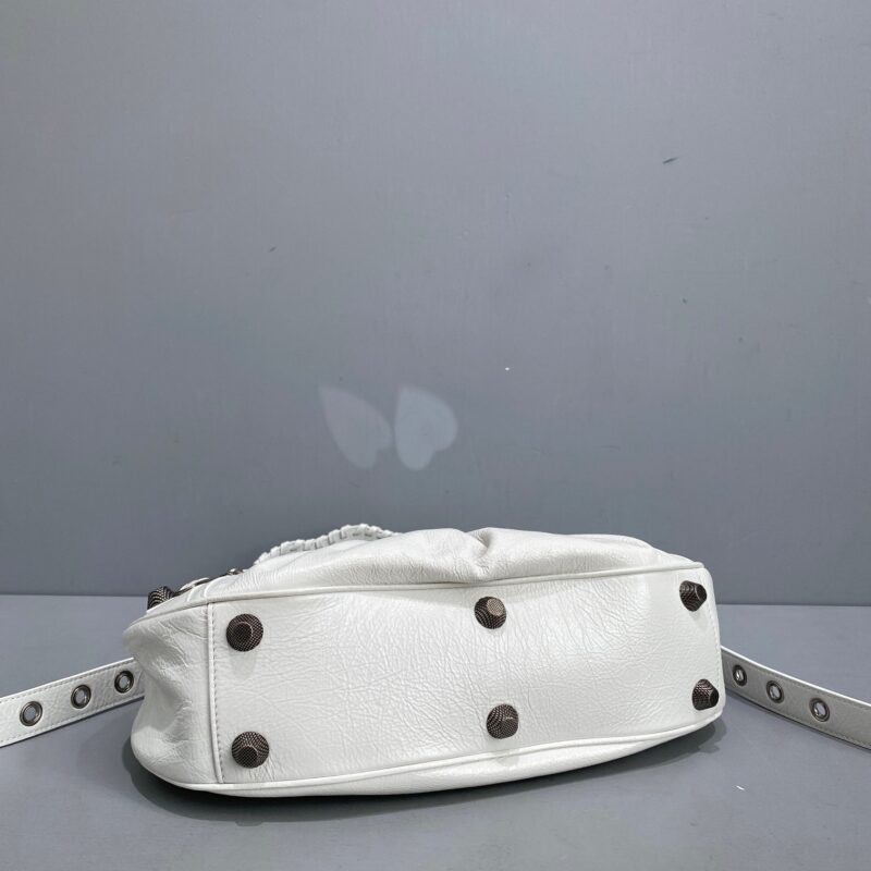 Big White Balenciaga Le Cagole Half Moon Armpit/Crossbody Bag The traditional motorcycle bag has been improved with adjustable woven shoulder straps, additional eyelets, external leather card holder, heart-shaped hanging mirror. Following the small and exquisite design of classic motorcycle elements, various carrying methods and each texture design is really enough. Now, the upper body is full of high-level sense and super casual atmosphere. Style number: 92718 Small size: length 30X height 16X width 8CMC Large size: length 33X height 16X width 8.4CMC