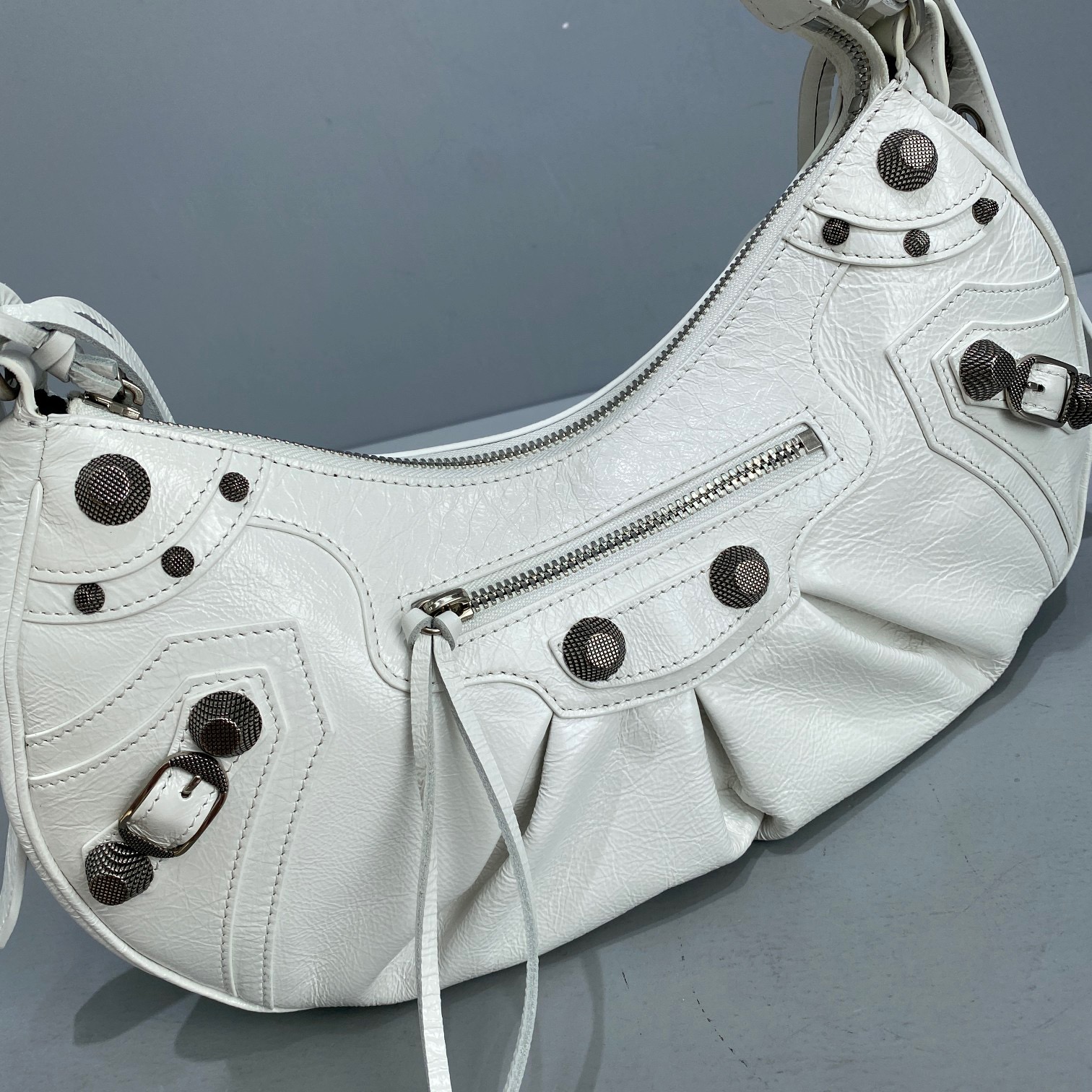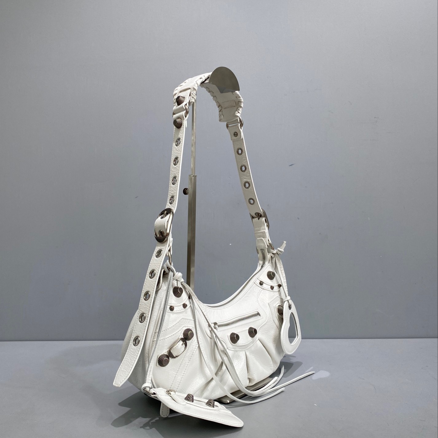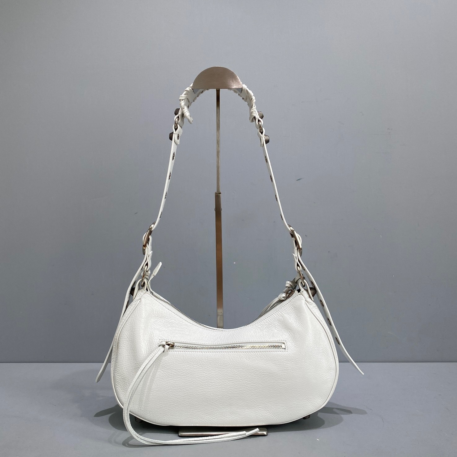Big White Balenciaga Le Cagole Half Moon Armpit/Crossbody Bag The traditional motorcycle bag has been improved with adjustable woven shoulder straps, additional eyelets, external leather card holder, heart-shaped hanging mirror. Following the small and exquisite design of classic motorcycle elements, various carrying methods and each texture design is really enough. Now, the upper body is full of high-level sense and super casual atmosphere. Style number: 92718 Small size: length 30X height 16X width 8CMC Large size: length 33X height 16X width 8.4CMC