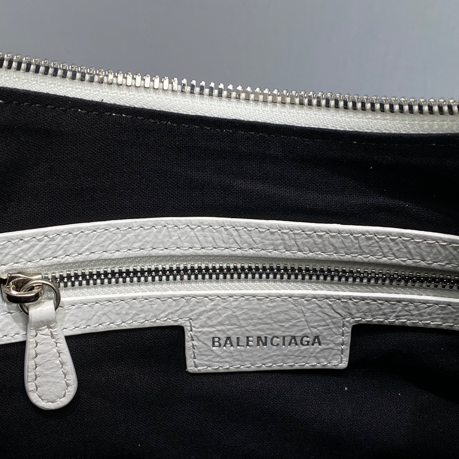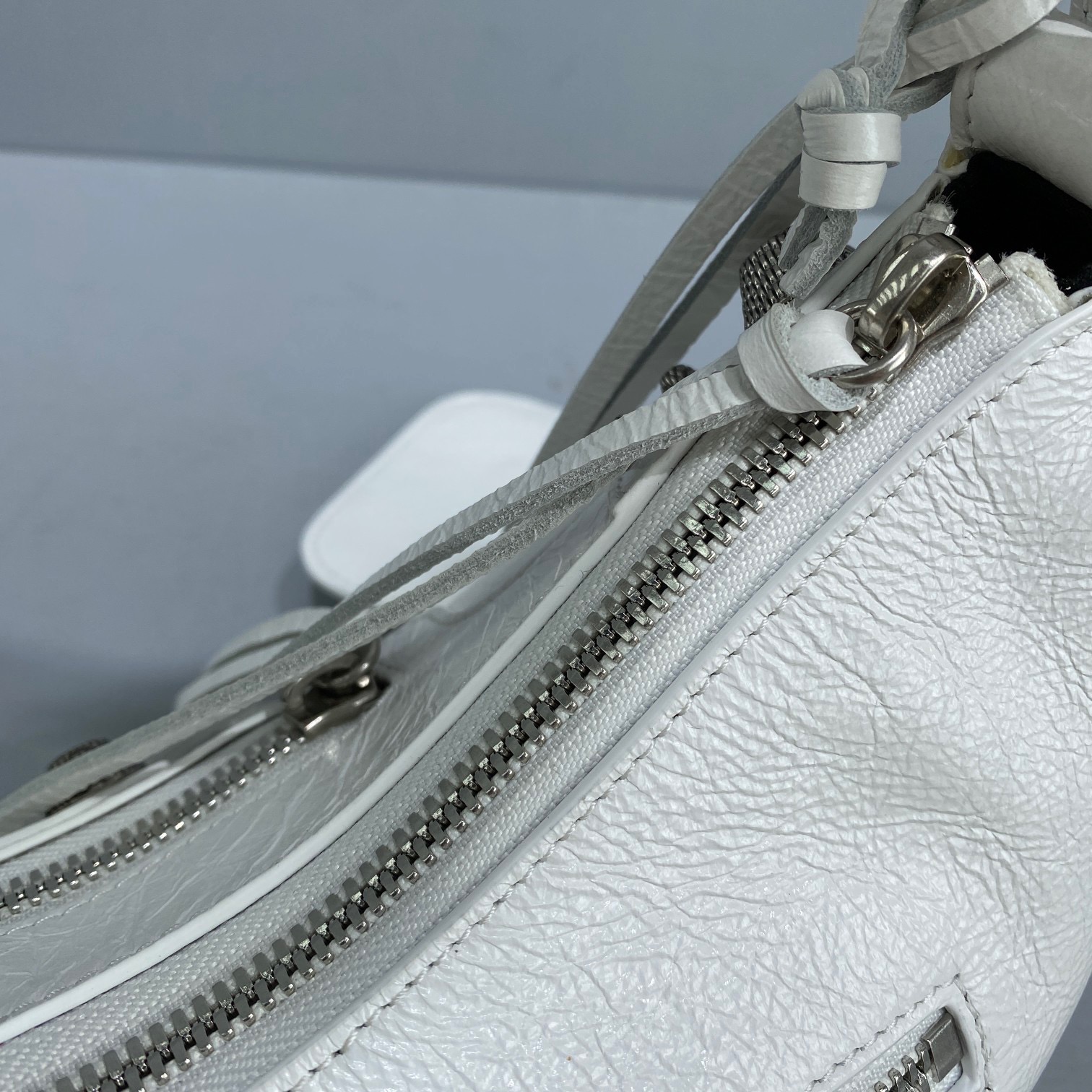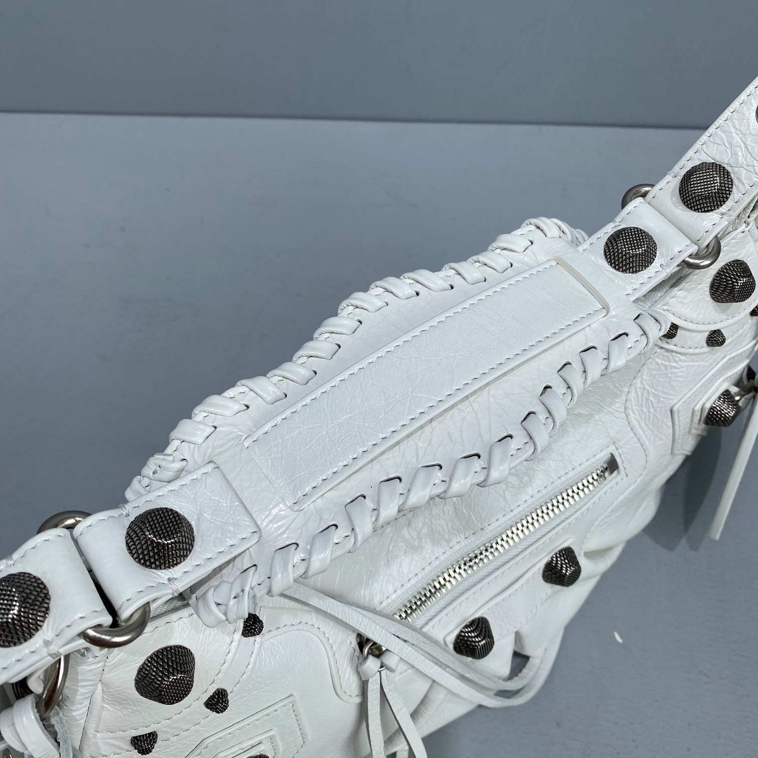 Big White Balenciaga Le Cagole Half Moon Armpit/Crossbody Bag The traditional motorcycle bag has been improved with adjustable woven shoulder straps, additional eyelets, external leather card holder, heart-shaped hanging mirror. Following the small and exquisite design of classic motorcycle elements, various carrying methods and each texture design is really enough. Now, the upper body is full of high-level sense and super casual atmosphere. Style number: 92718 Small size: length 30X height 16X width 8CMC Large size: length 33X height 16X width 8.4CMC