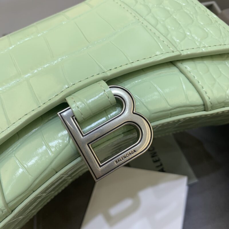 【Mini 】Original Balenciaga Mint Green Crocodile Pattern Hourglass Bag The unique iconic arc shape is very recognizable, and it is so cool at first glance. The appearance is in the shape of a half moon. A metal B-shaped pull ring. The cowhide texture is also very touching and has a strong accent. Daily necessities are still carefully selected, versatile and trendy. This year, this Balenciaga hourglass bag will definitely be a mess, elegant. Size: 19-8-11cm