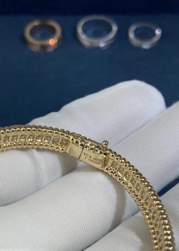 The metal used in pieces of jewelry are often a lustrous yellow or white gold, which is expertly polished to a mirror-like finish. The precious stones are carefully selected by our masters and set in a precise manner, showing off their color, clarity, and brilliance to their full potential.