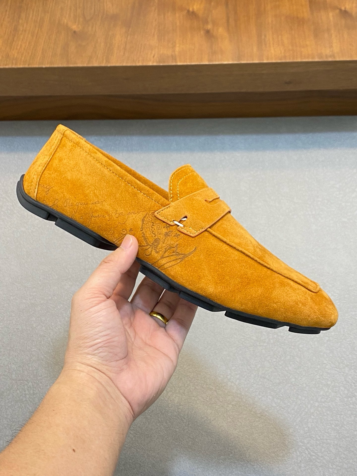 This model is made of Venezia calfskin upper, asymmetrical Venezia Scritto pattern decoration, calfskin insole and lining, rubber outsole.