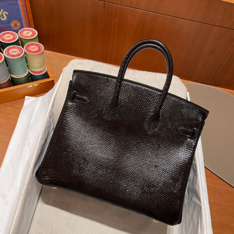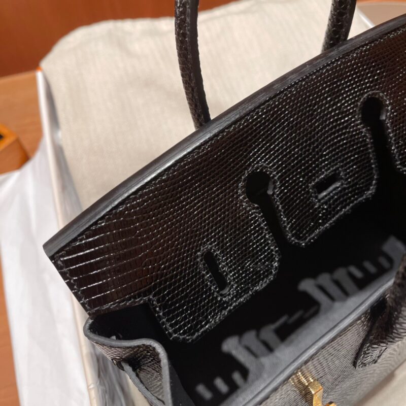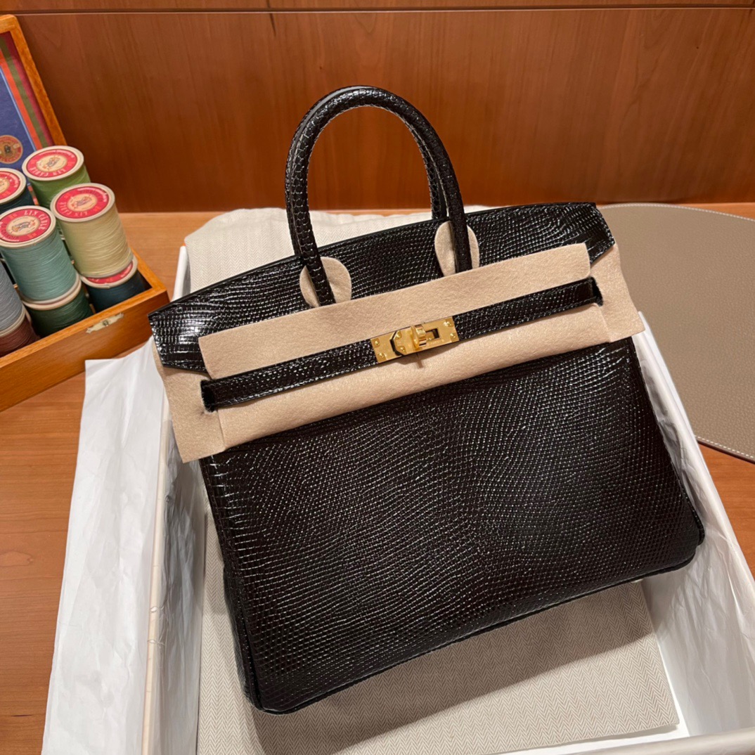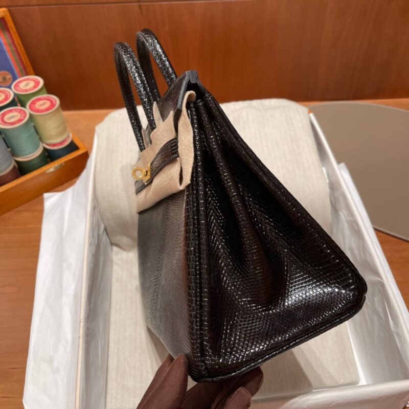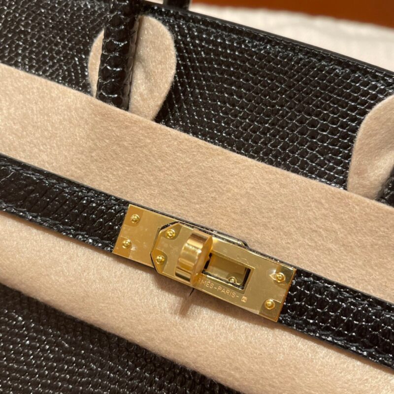 Birkin 25cm Lizard leather. 89 Black (Noir). Gold Buckle