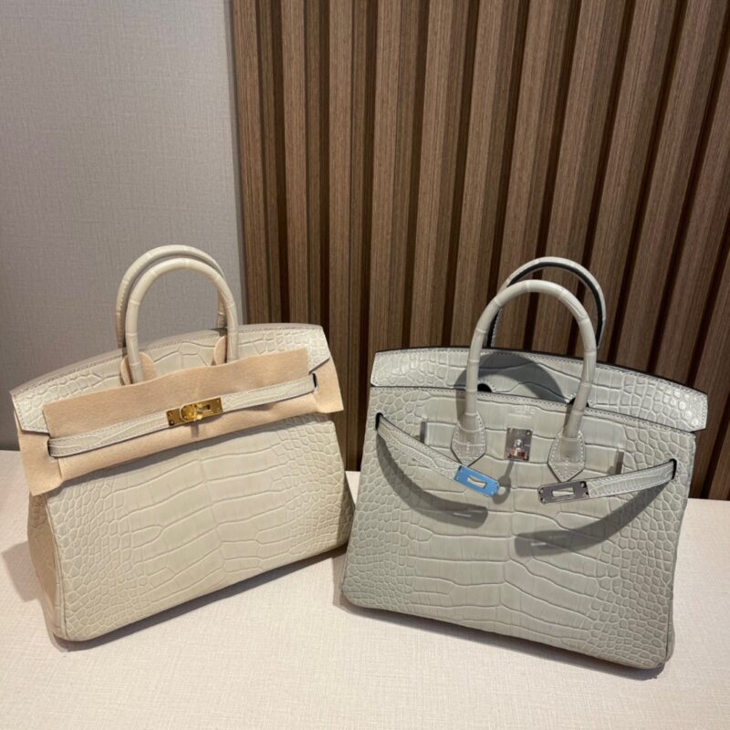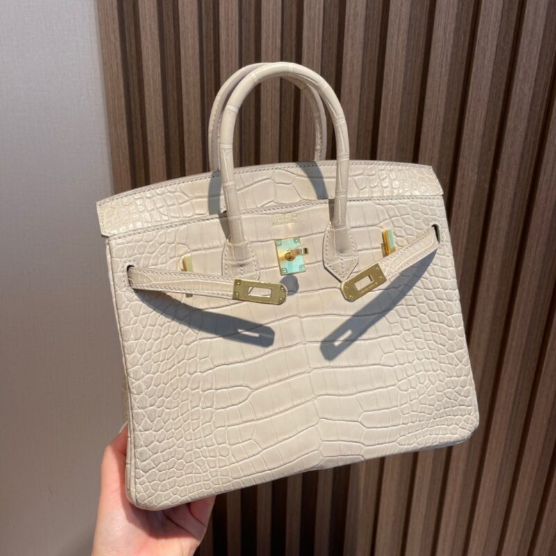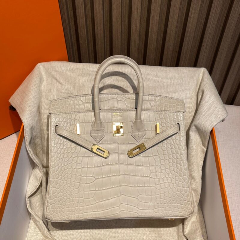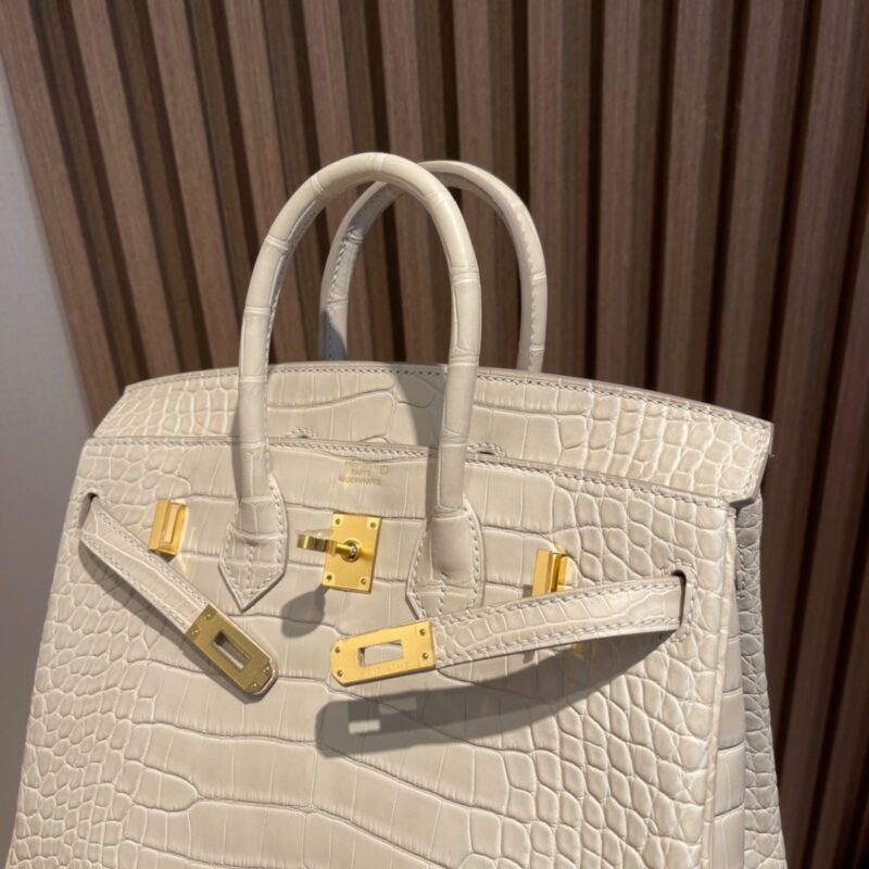 Birkin 25cm Matte Alligator Leather. 8L Glacier White (Beton). Gold Buckle