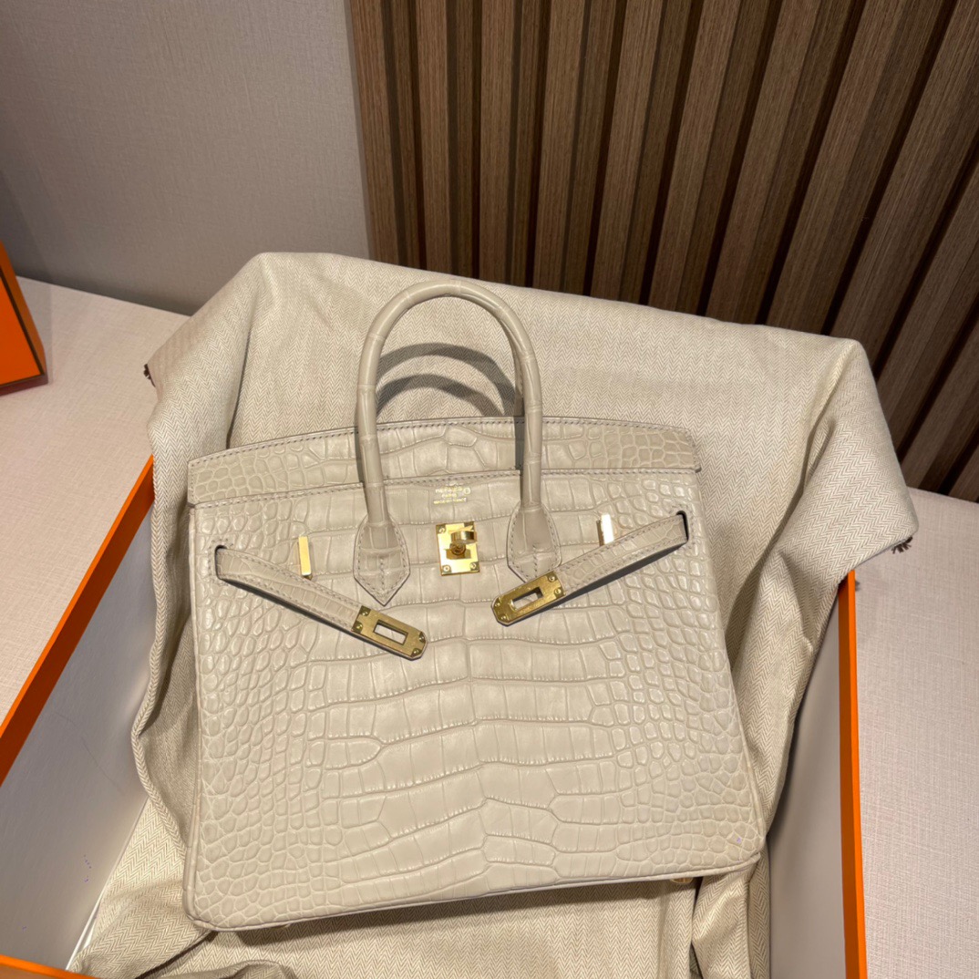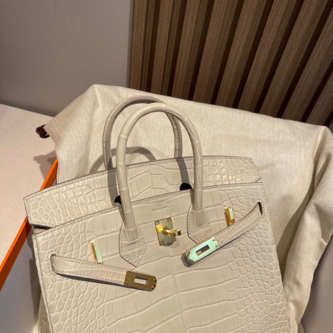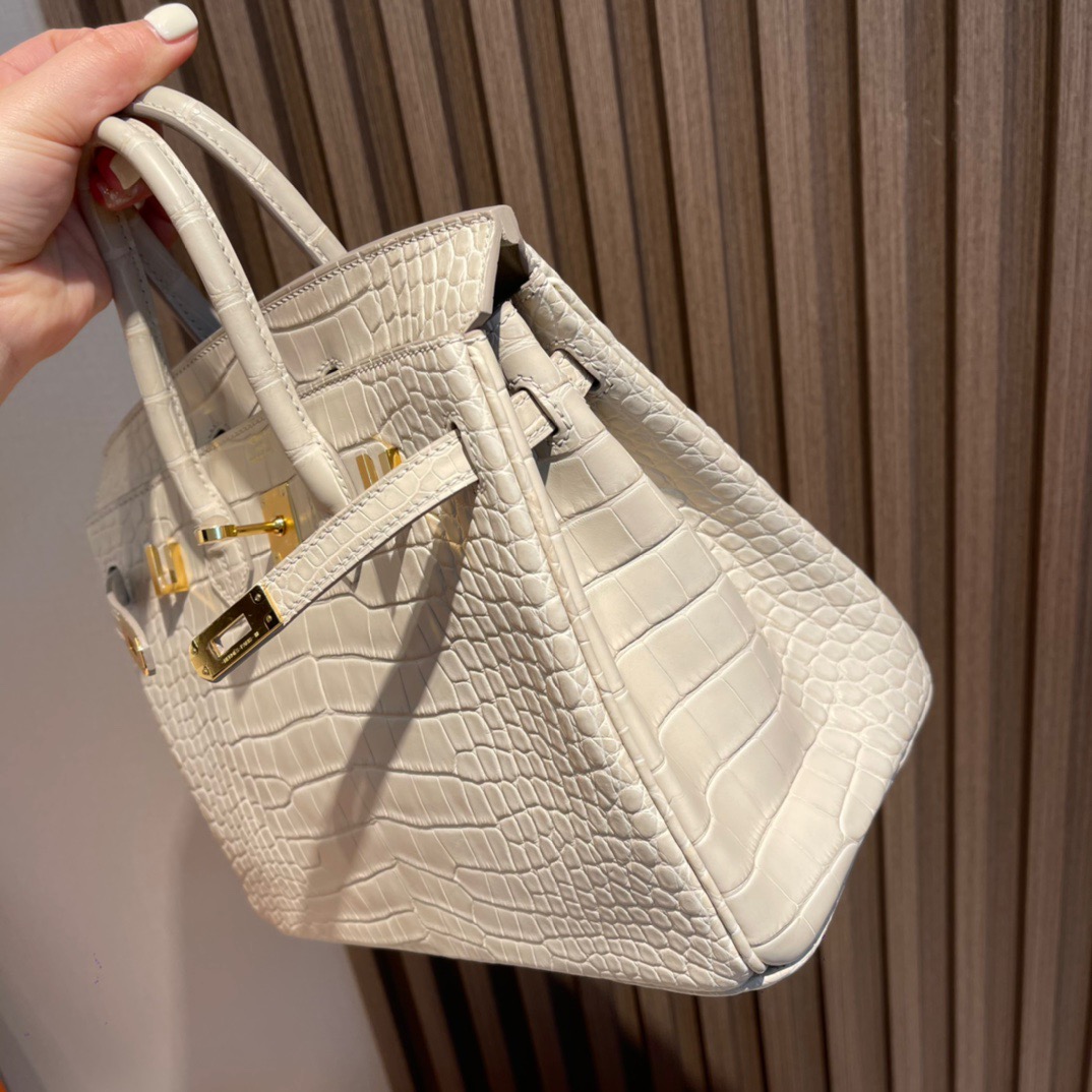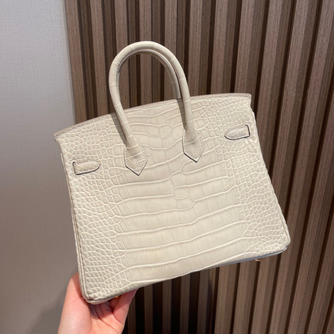 Birkin 25cm Matte Alligator Leather. 8L Glacier White (Beton). Gold Buckle
