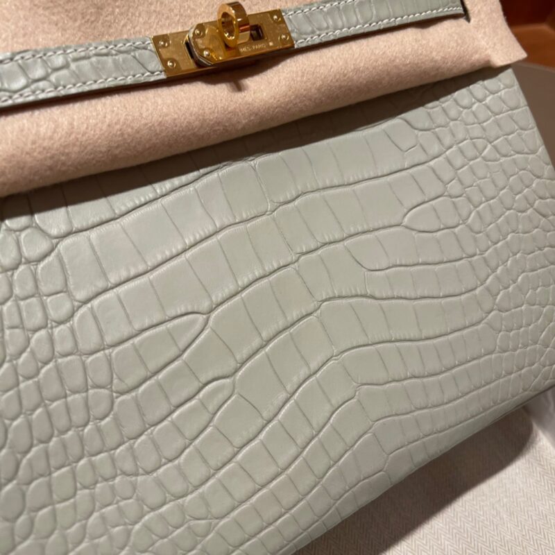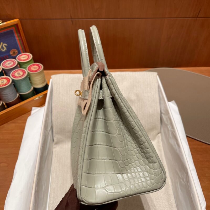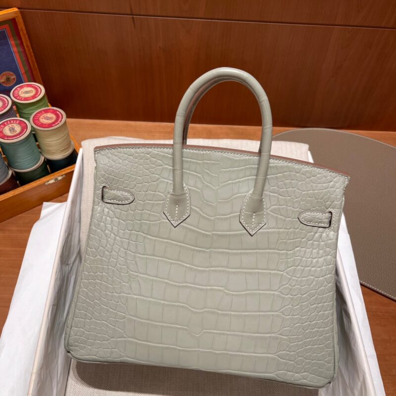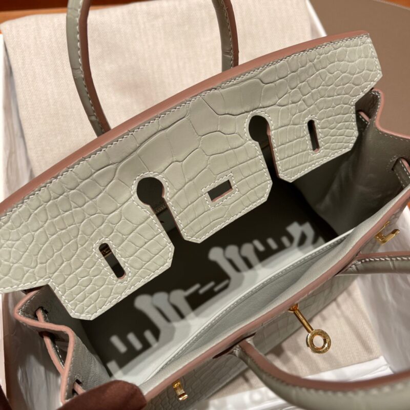 Birkin 25cm Matte Alligator leather. Carved Square 80 Pearl Grey (Gris Perle). Gold Buckle