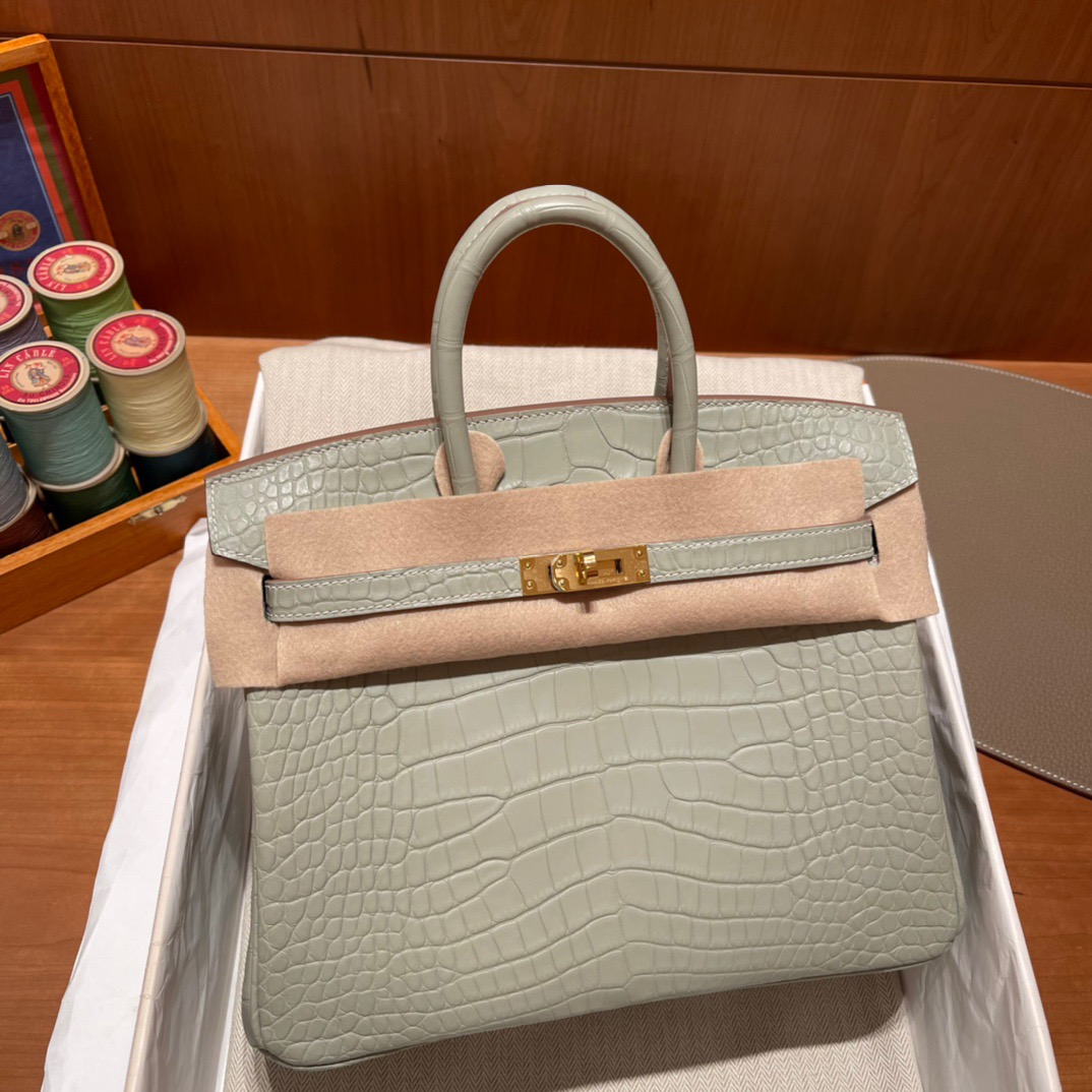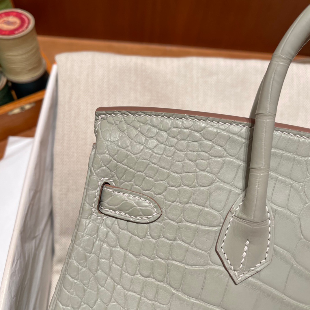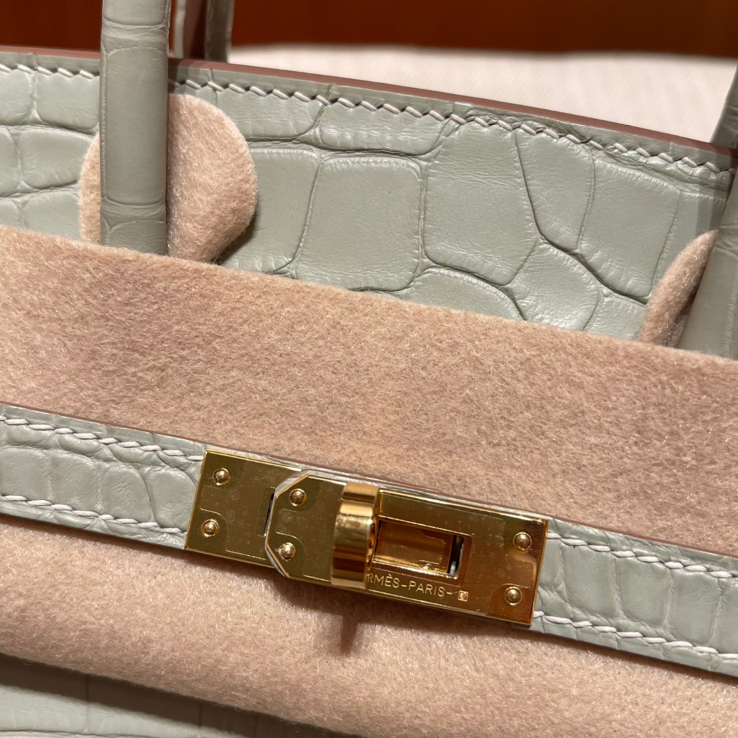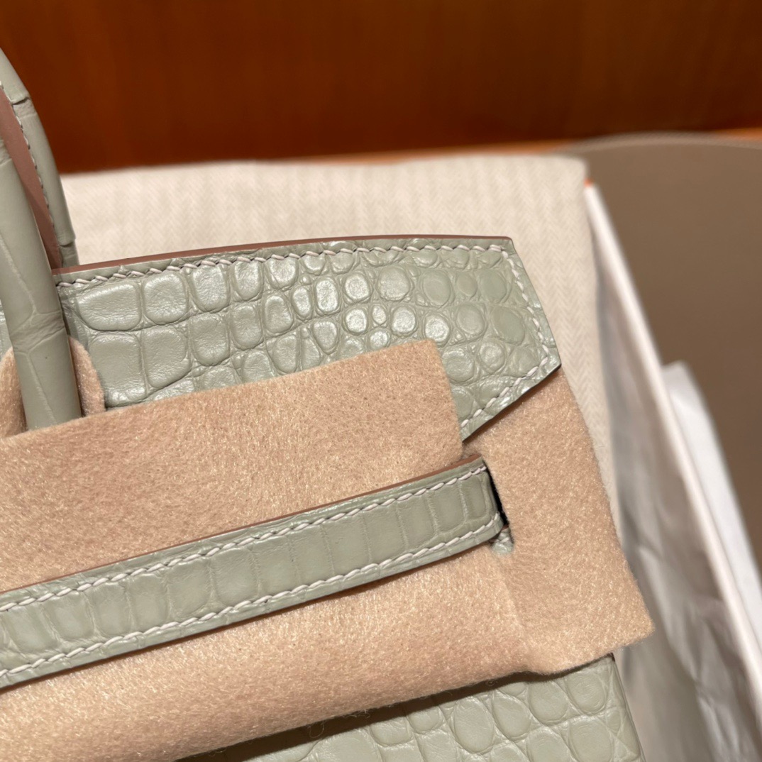 Birkin 25cm Matte Alligator leather. Carved Square 80 Pearl Grey (Gris Perle). Gold Buckle