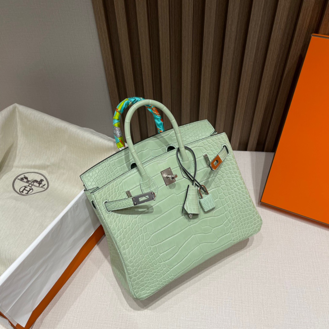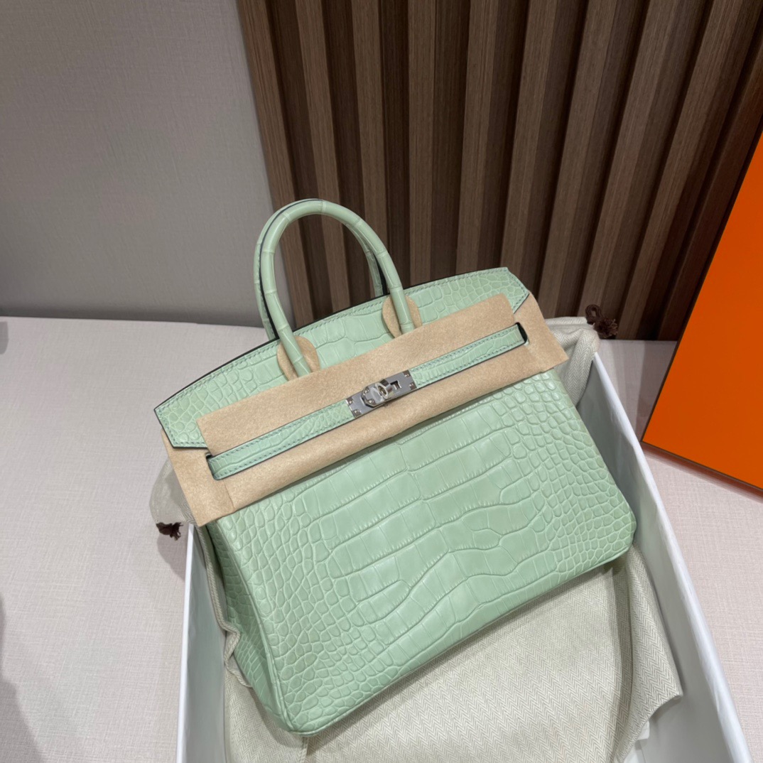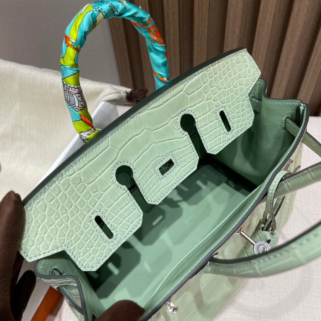 Birkin 25cm Matte Alligator. 6U Mint Green (Vert D’Eau). Silver Buckle
