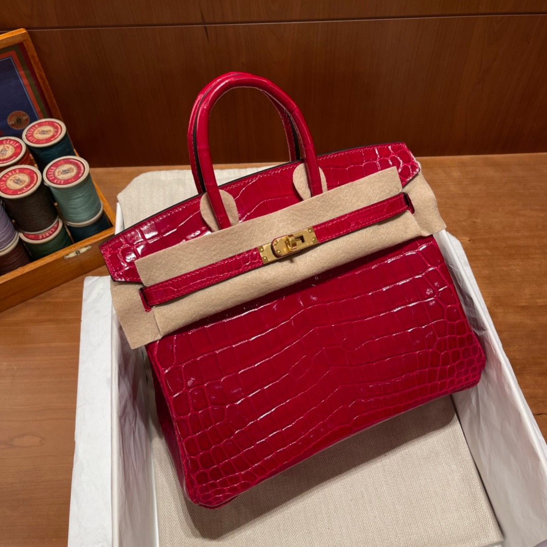 Birkin 25cm Nile Crocodile Shiny Leather. Engraved Highlights. Q5 Flag Red (Rouge Casaque). Gold Buckle