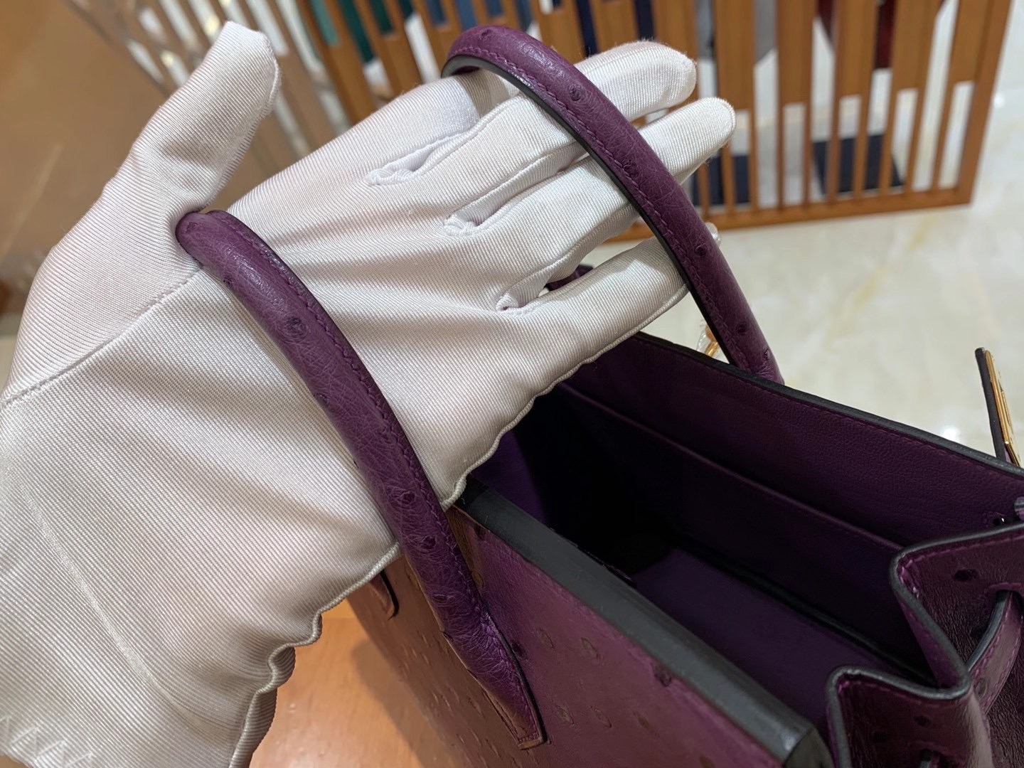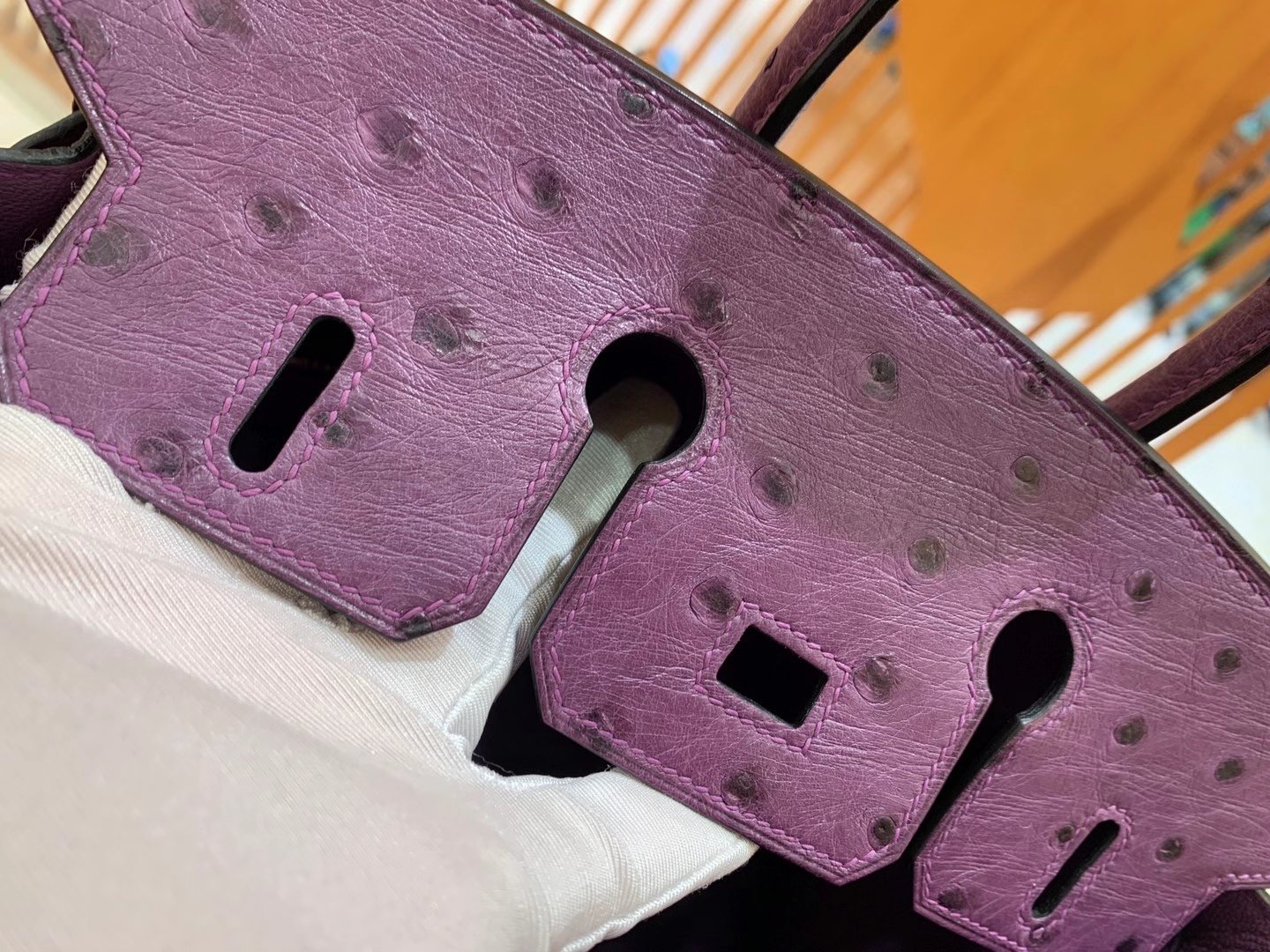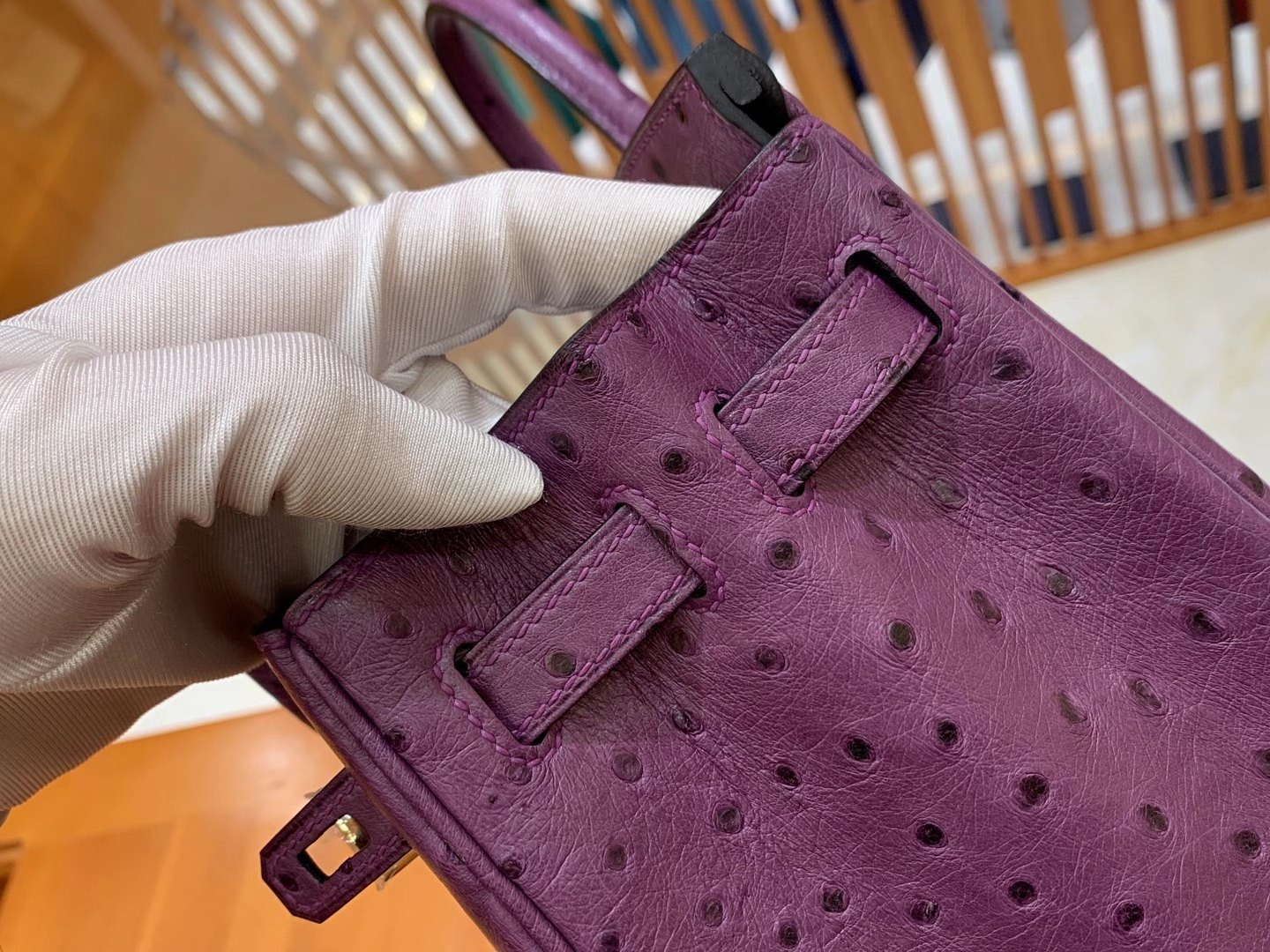 Birkin 25cm Anemone Purple Gold BuckleImported South African KK grade ostrich leather. Hand-sewn