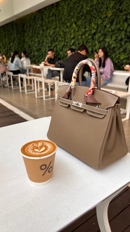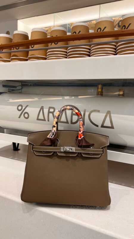 Birkin 25 in Swift leather. In Etoupe grey color with silver hardware.