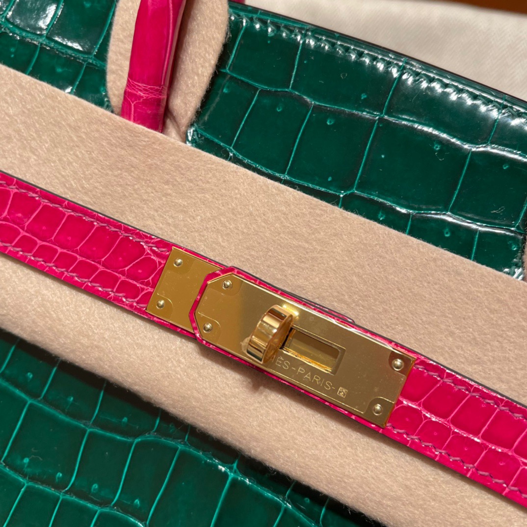 Birkin 30cm Alligator Porocus Shiny. 67 Emerald/5J Pink. Gold Buckle