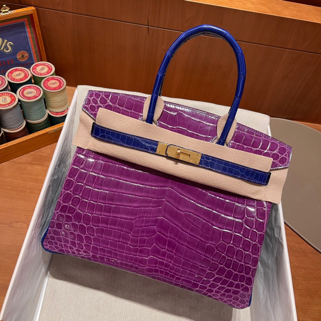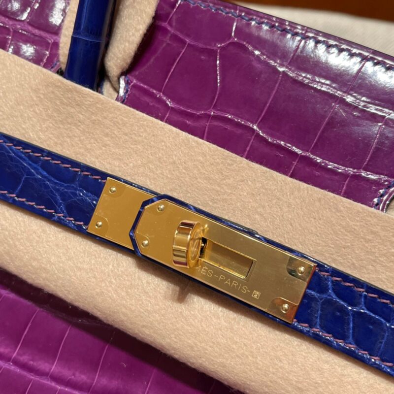 Birkin 30cm Alligator Porocus Shiny. 5L Extreme Purple/7T Electric Blue. Gold Buckle