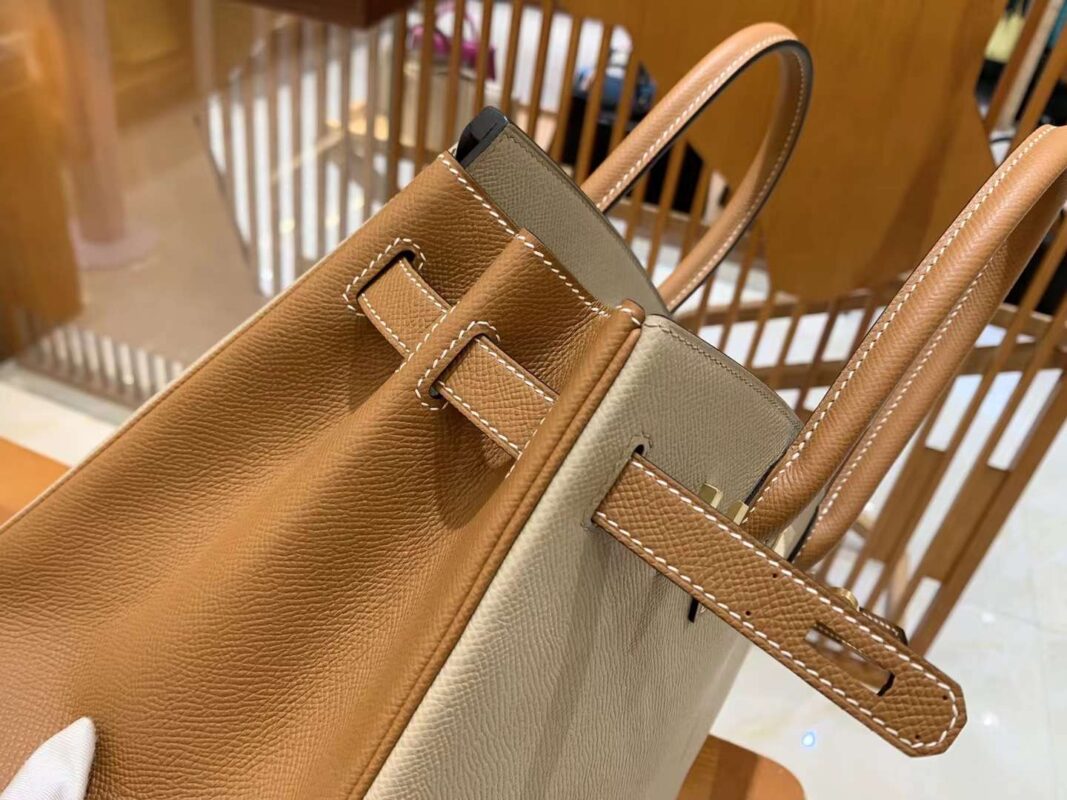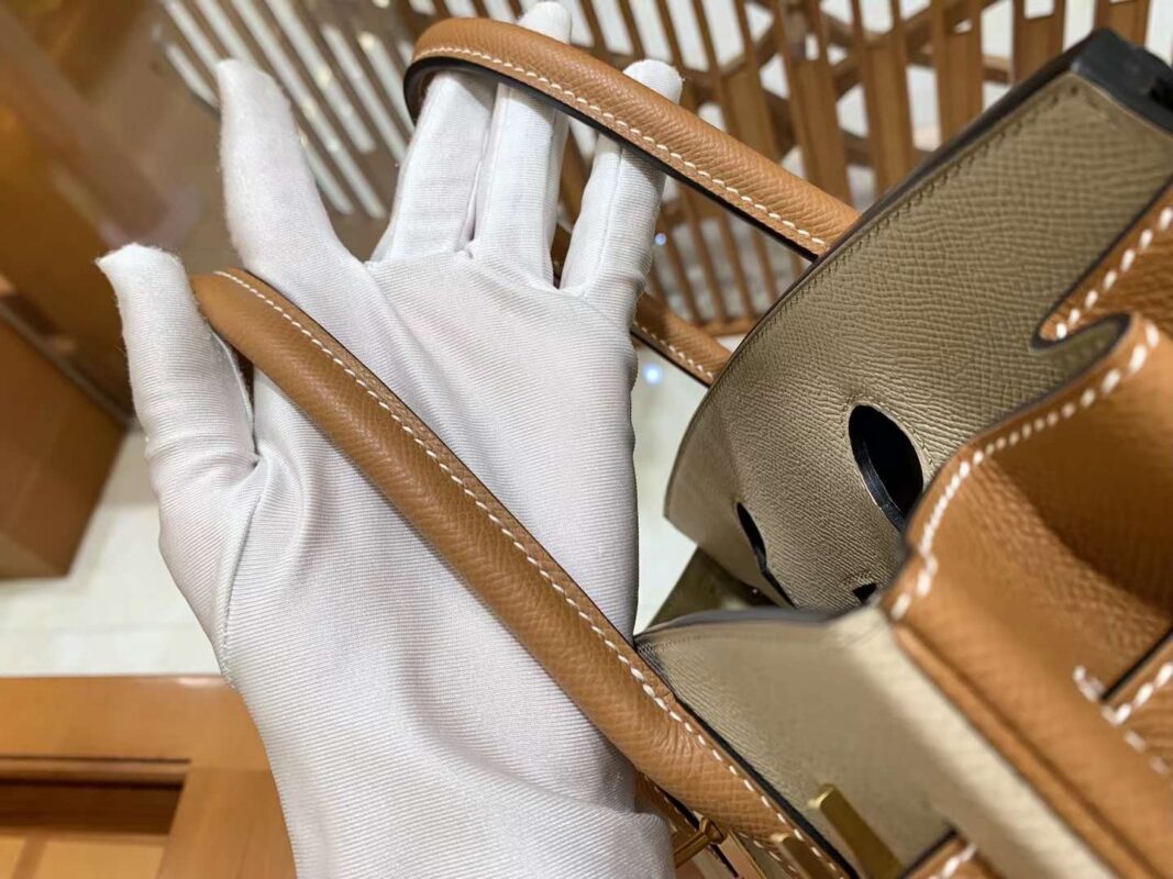 BK30cm Turtle Dove Grey with Golden Brown Gold Buckle. Imported Epsom Cowhide. French Original Beeswax Thread. Fully Hand Sewn