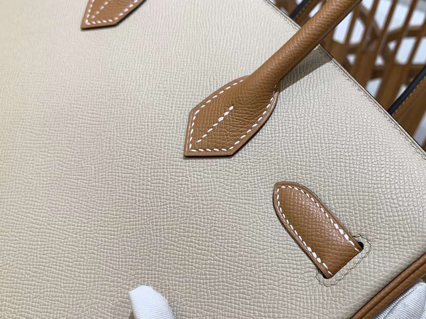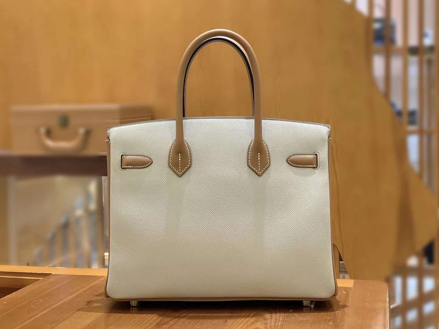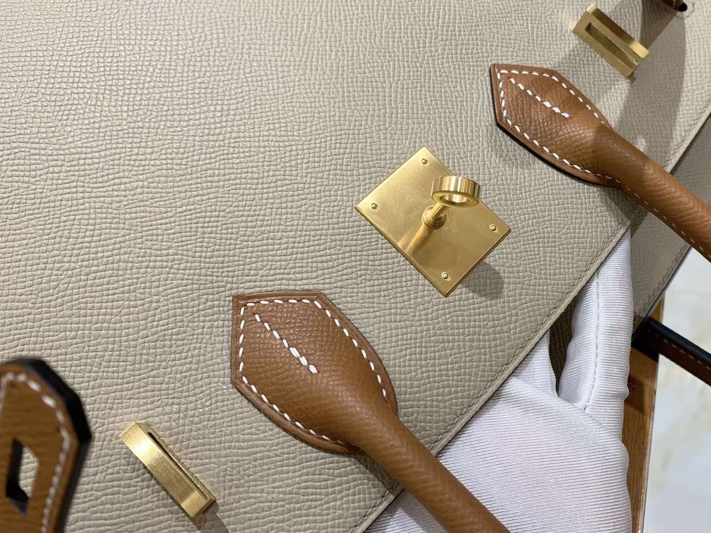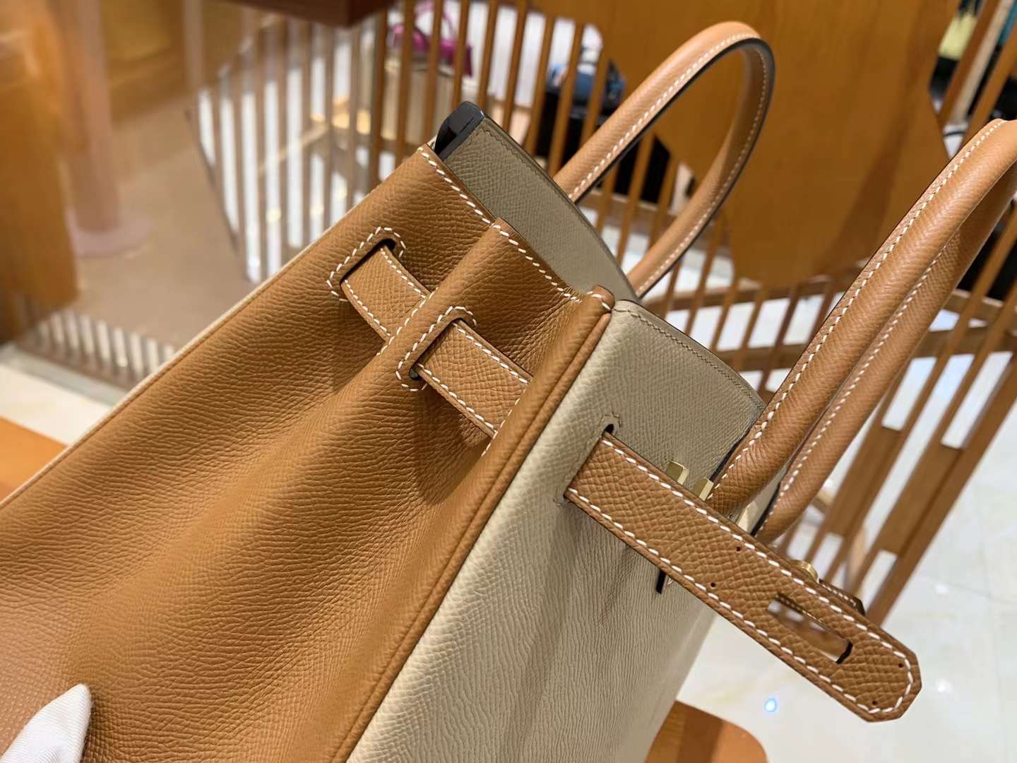 BK30cm Turtle Dove Grey with Golden Brown Gold Buckle. Imported Epsom Cowhide. French Original Beeswax Thread. Fully Hand Sewn