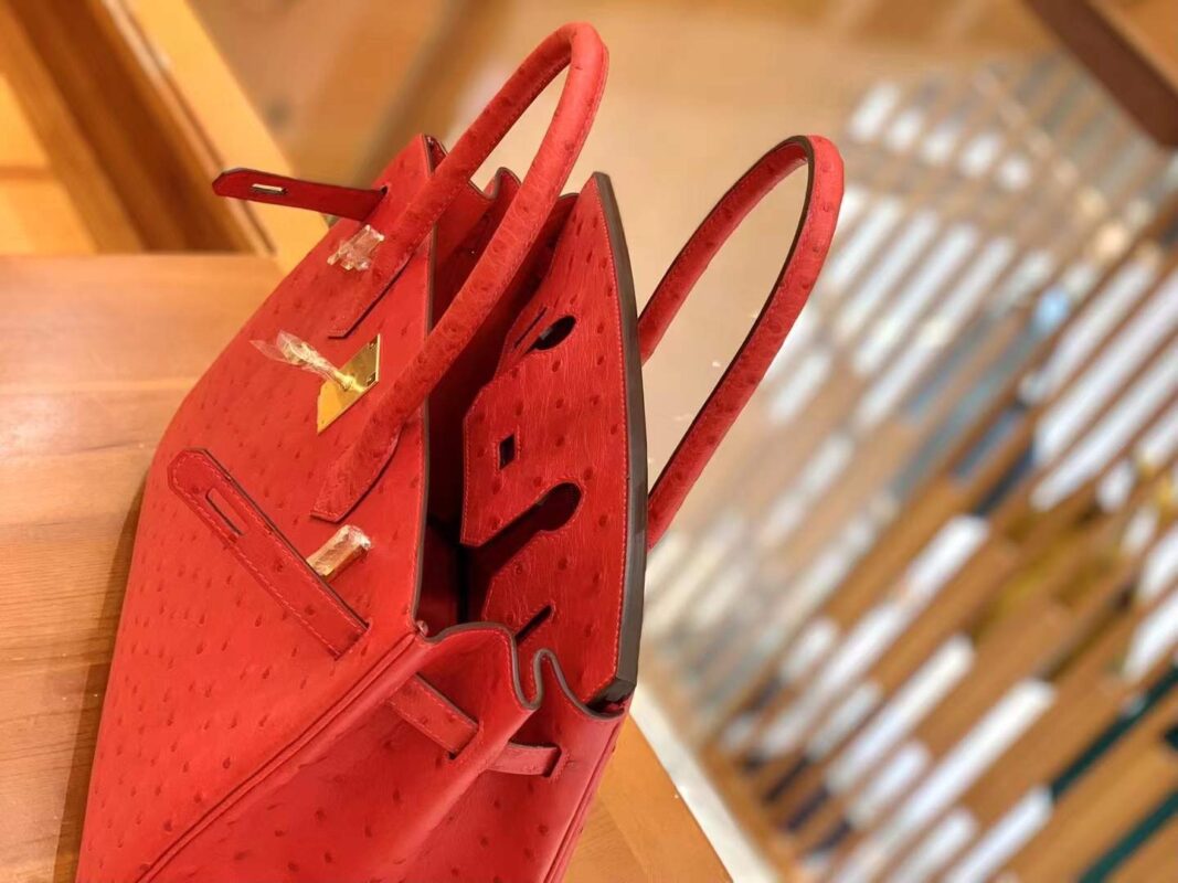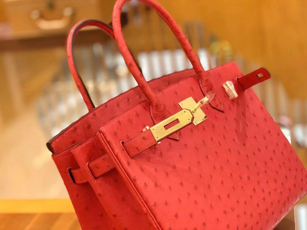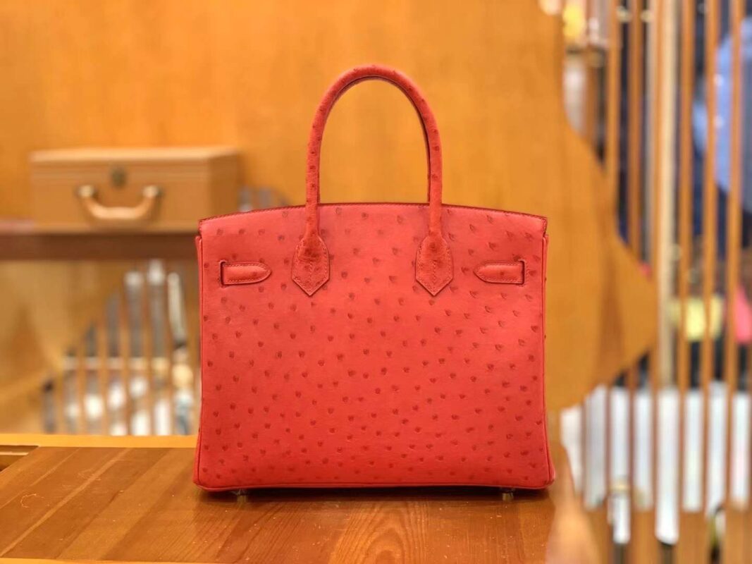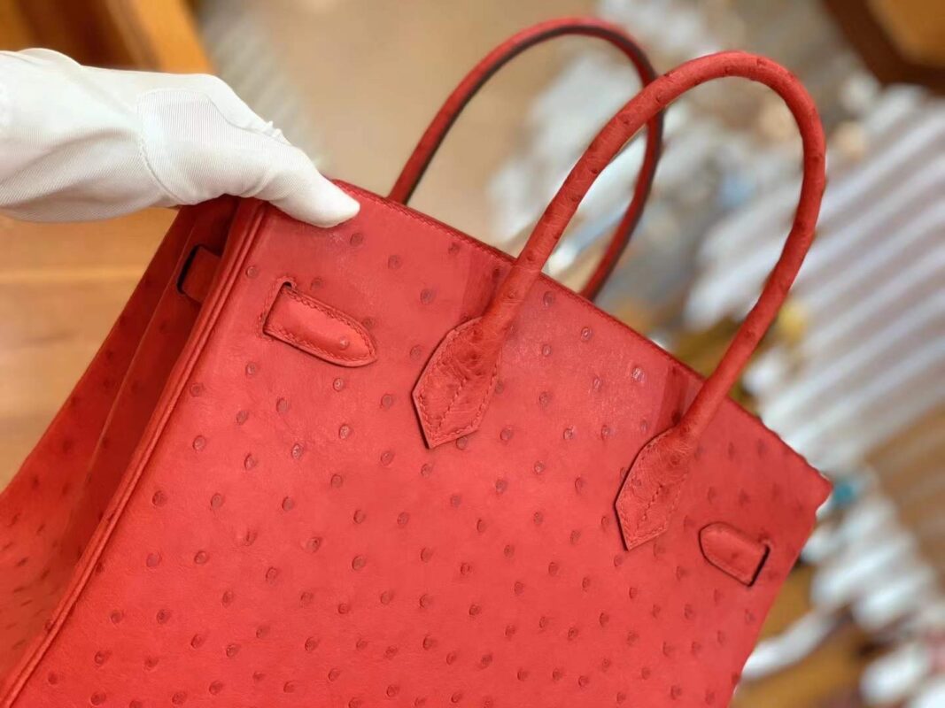Birkin 30cm Red Imported KK ostrich leather. French beeswax thread. 100% hand-sewn
