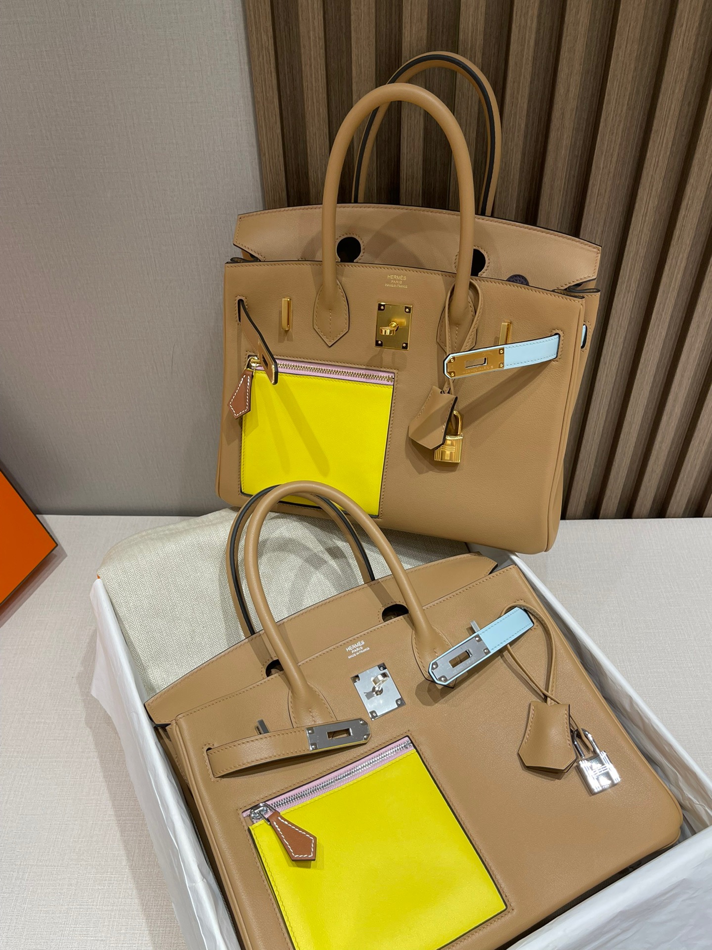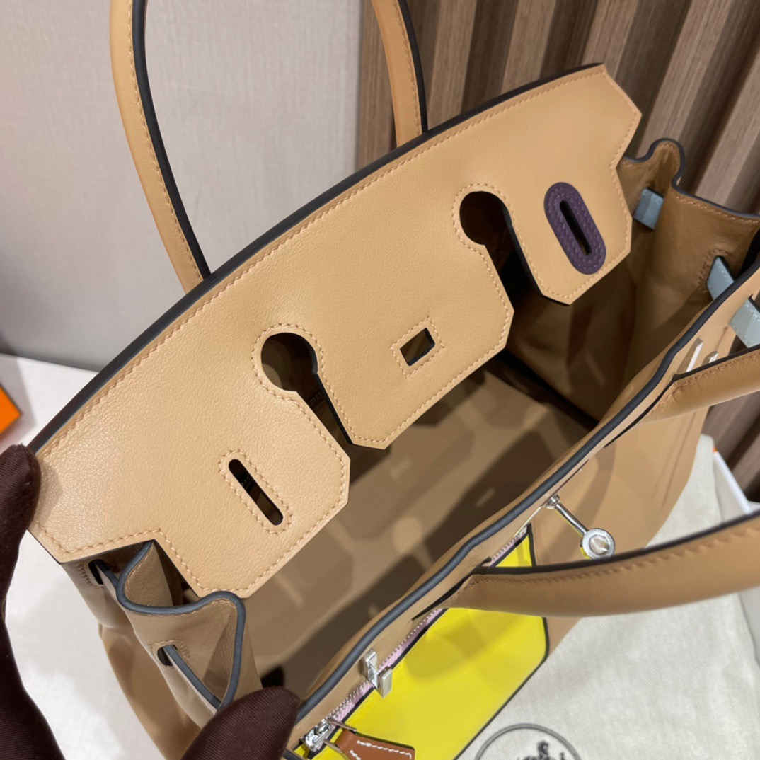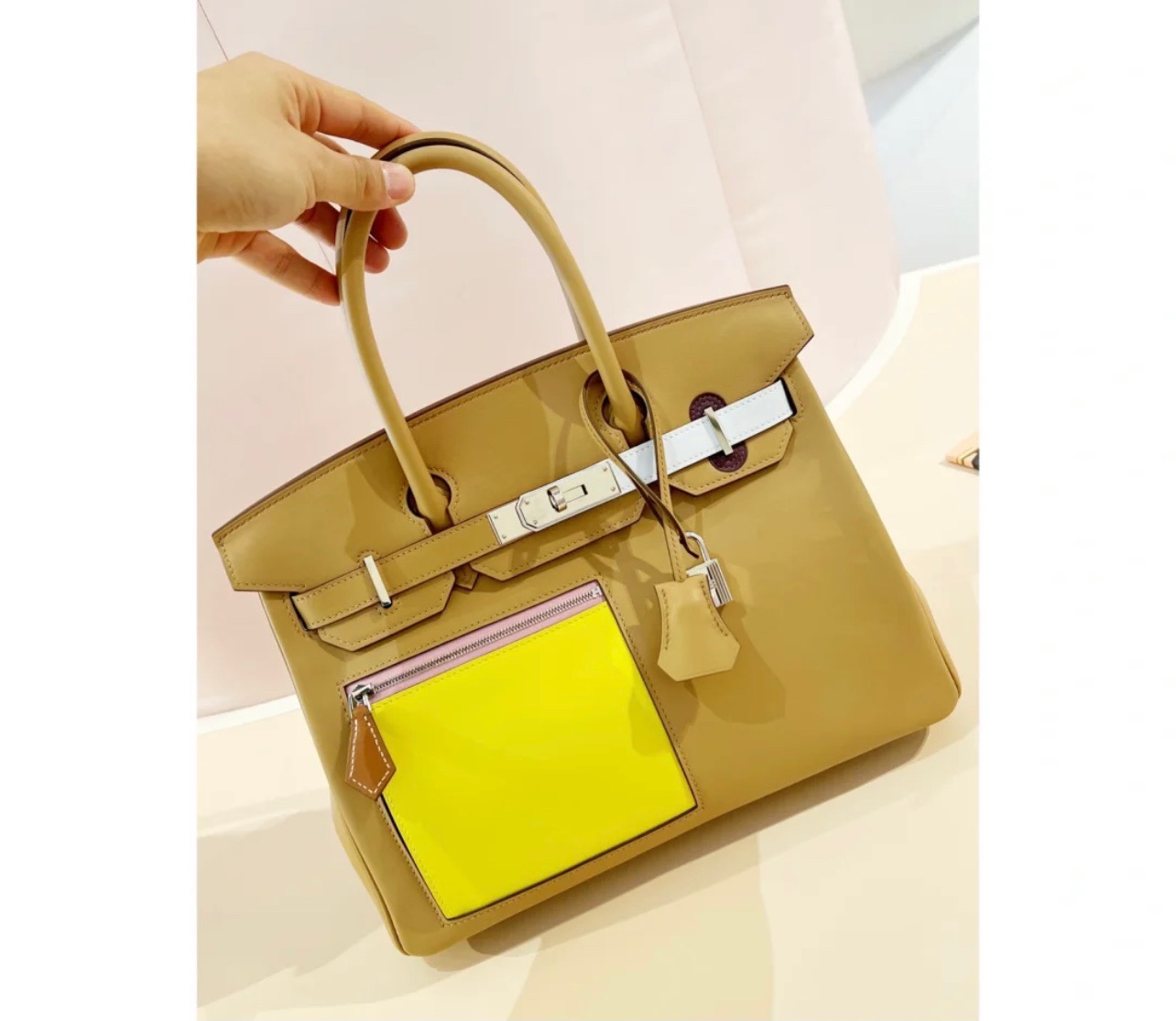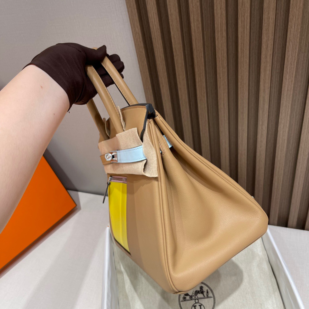 Birkin Colormatic Deformation Bag/Single Pull Bag Another headshot series. The storm screams, the swift leather feels so wow. Add color-blocking elements. All-inclusive swift leather. Front square pocket design makes the whole bag cooler. The back pocket is super convenient to tuck your phone at any time 0M tan/R9 lemon yellow/X9 mallow/T0 fog blue/i2 cream white