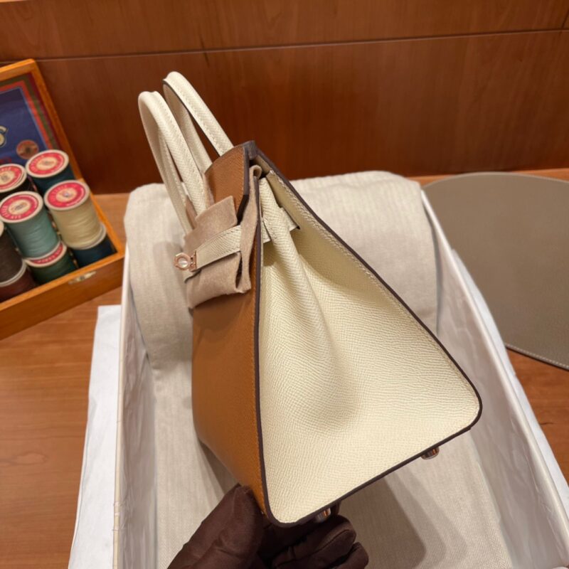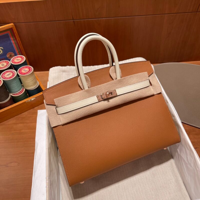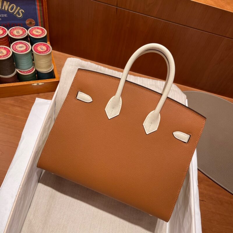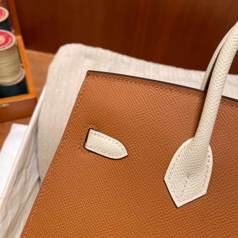 Birkin 25cm Outer Seam. Epsom Leather. Golden Brown/10 Milkshake White. Bronze Buckle