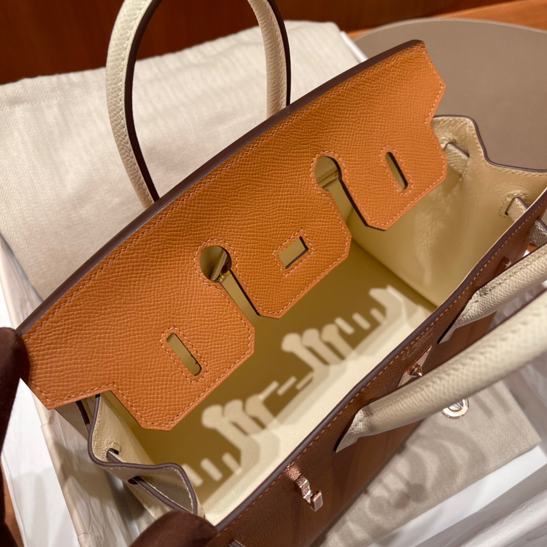 Birkin 25cm Outer Seam. Epsom Leather. Golden Brown/10 Milkshake White. Bronze Buckle