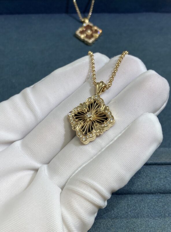 The metal used in pieces of jewelry are often a lustrous yellow or white gold, which is expertly polished to a mirror-like finish. The precious stones are carefully selected by our masters and set in a precise manner, showing off their color, clarity, and brilliance to their full potential.