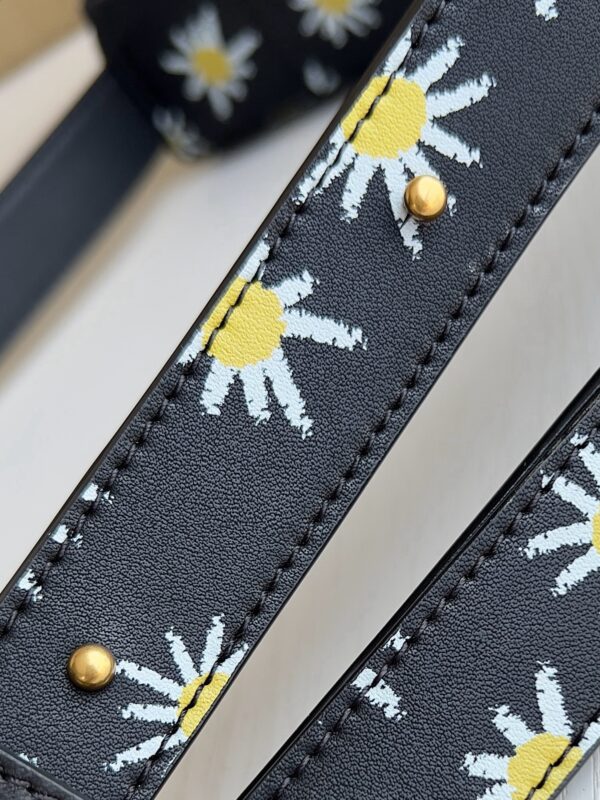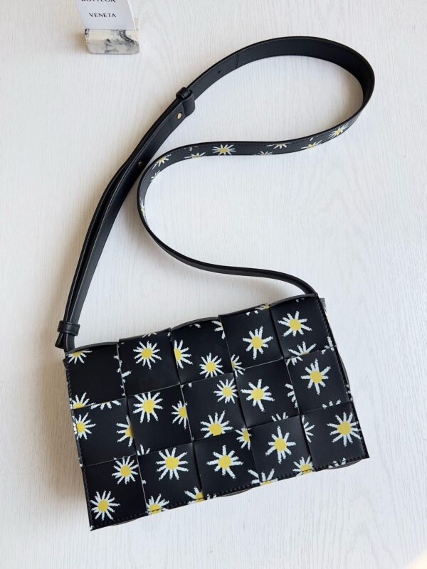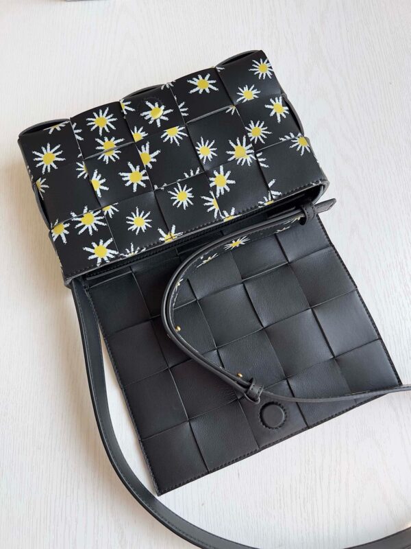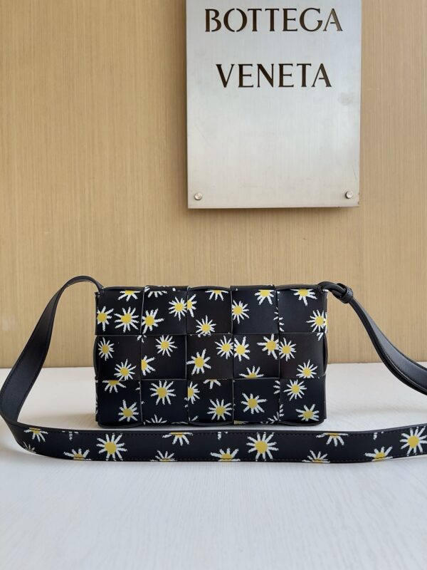 Сумка через плечо Bottega Veneta Cassette имеет плетеный квадрат «5×3», а яркий принт в виде ромашек естественным образом переходит от корпуса сумки к ремню через плечо и ниспадает на плечи, создавая весеннюю атмосферу. Принт с ромашковым узором придает сумке контрастную красоту и естественную жизненную силу, благодаря чему она выглядит красиво и мило в полной форме.