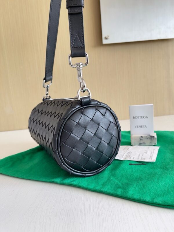 Миниатюрная плетеная цилиндрическая сумка BOTTEGA VENETA 2024, симпатичной формы, крутая спинка, аккуратный и фактурный уплотнитель, мягкая восковая кожа, оснащена регулируемыми и съемными ремнями и металлическими D-образными кольцами.