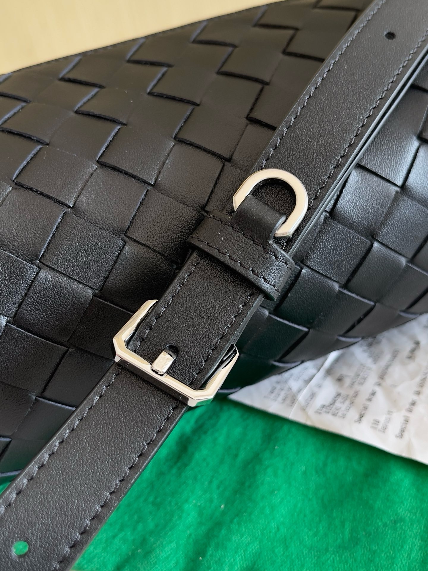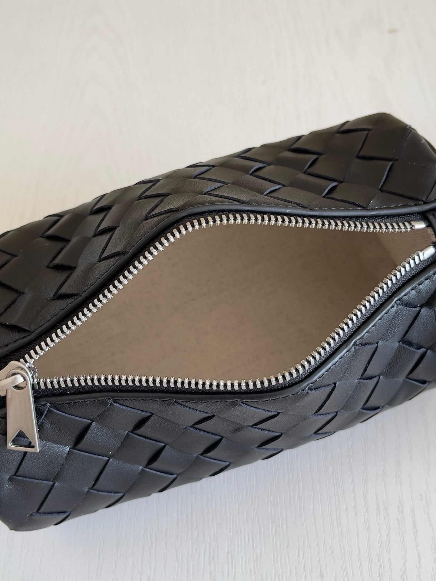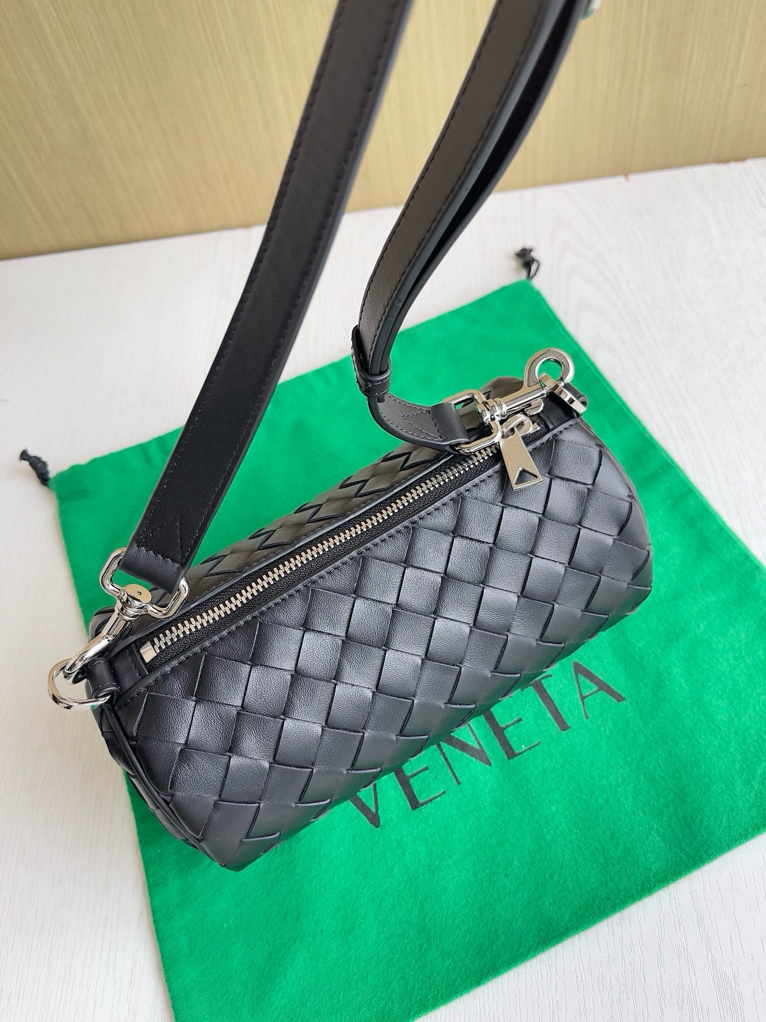 Миниатюрная плетеная цилиндрическая сумка BOTTEGA VENETA 2024, симпатичной формы, крутая спинка, аккуратный и фактурный уплотнитель, мягкая восковая кожа, оснащена регулируемыми и съемными ремнями и металлическими D-образными кольцами.