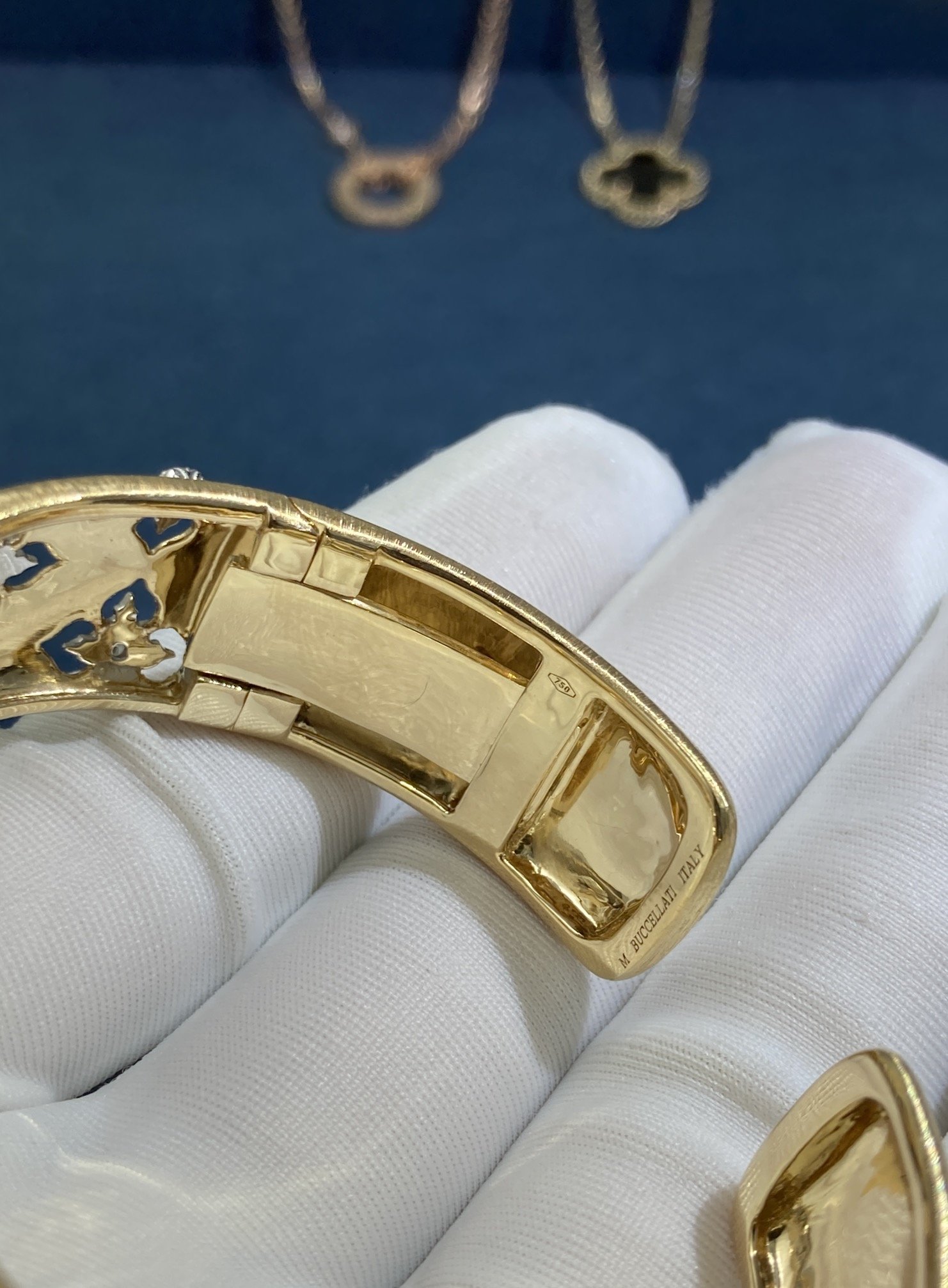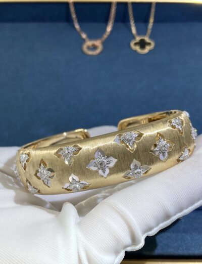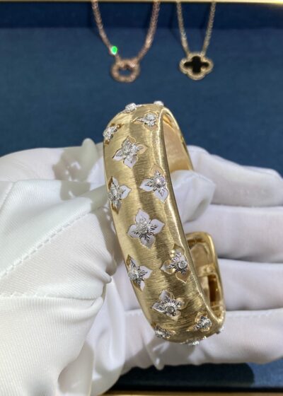 The metal used in pieces of jewelry are often a lustrous yellow or white gold, which is expertly polished to a mirror-like finish. The precious stones are carefully selected by our masters and set in a precise manner, showing off their color, clarity, and brilliance to their full potential.