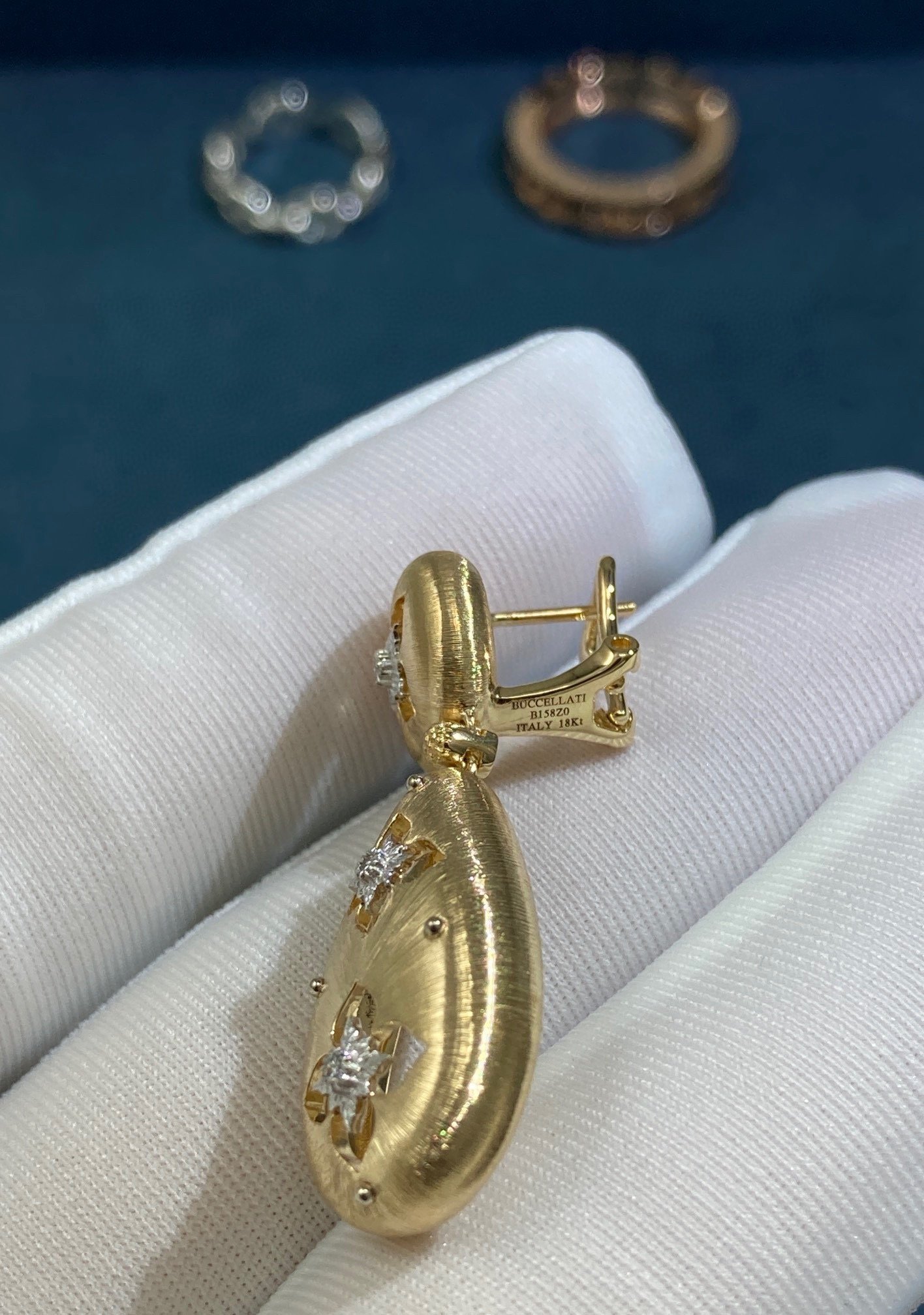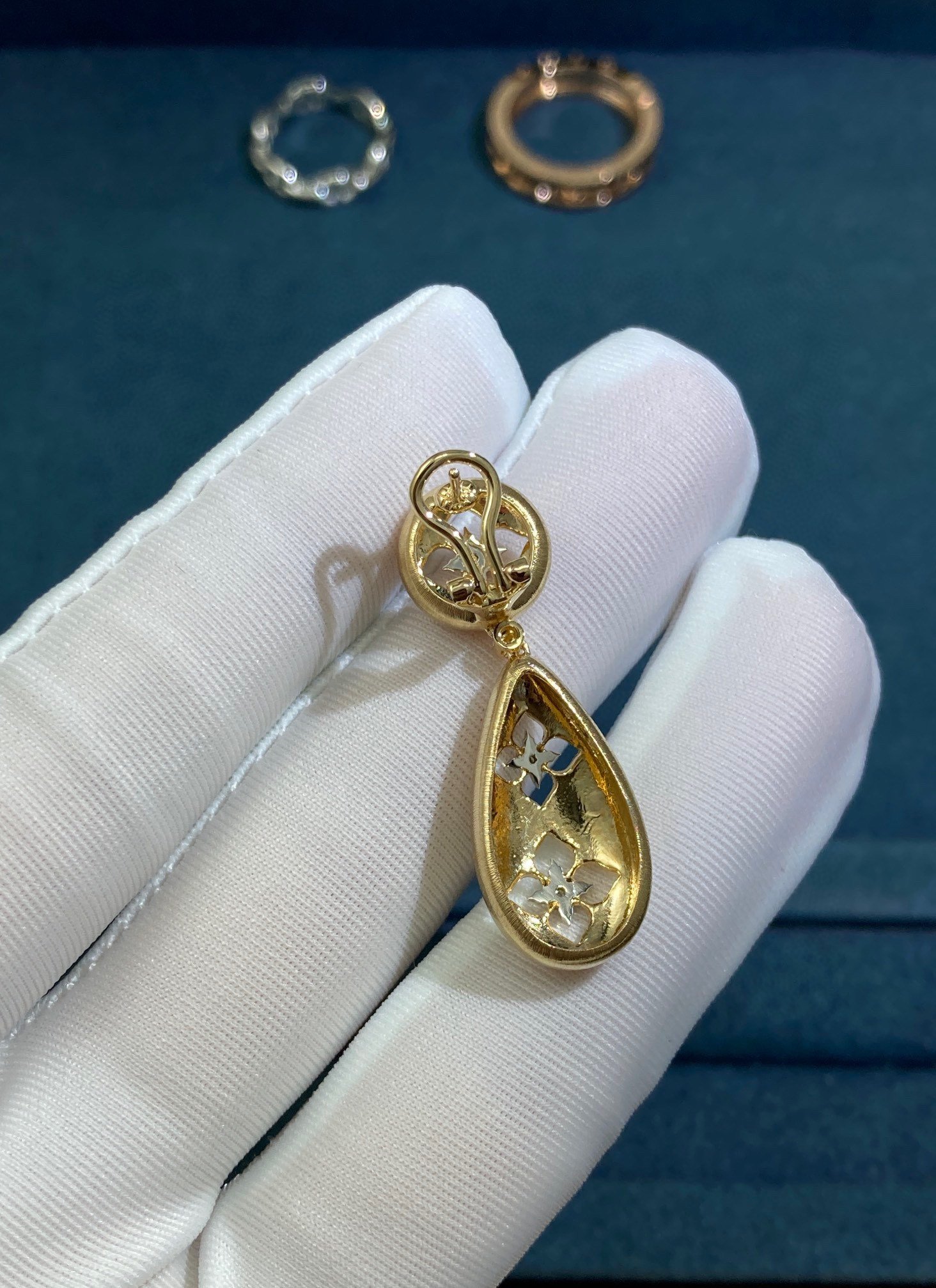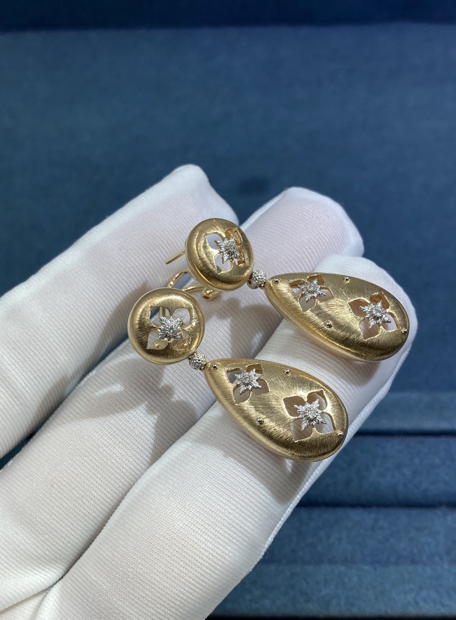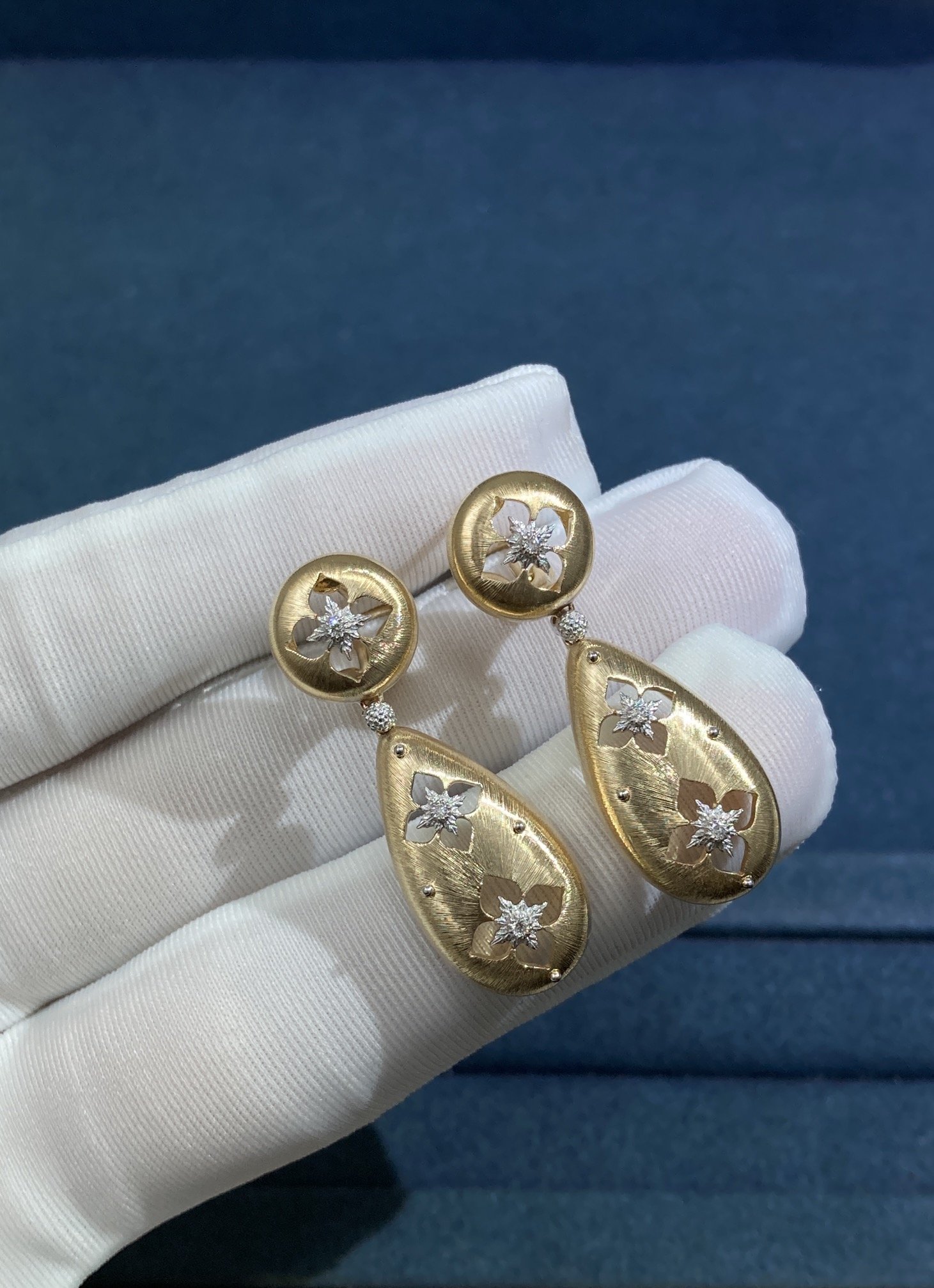 The metal used in pieces of jewelry are often a lustrous yellow or white gold, which is expertly polished to a mirror-like finish. The precious stones are carefully selected by our masters and set in a precise manner, showing off their color, clarity, and brilliance to their full potential.
